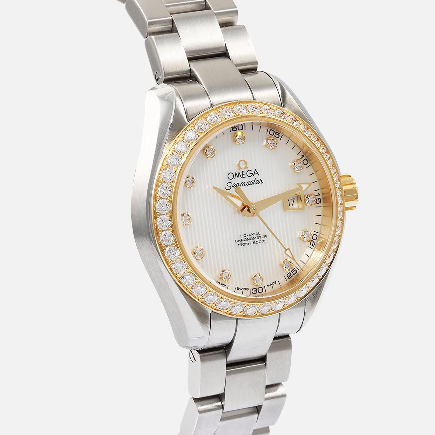 The silver dial features diamond hour markers and is complemented by the gold hour and minute hands. The automatic movement, Omega Calibre 8800, ensures the time is always accurate.