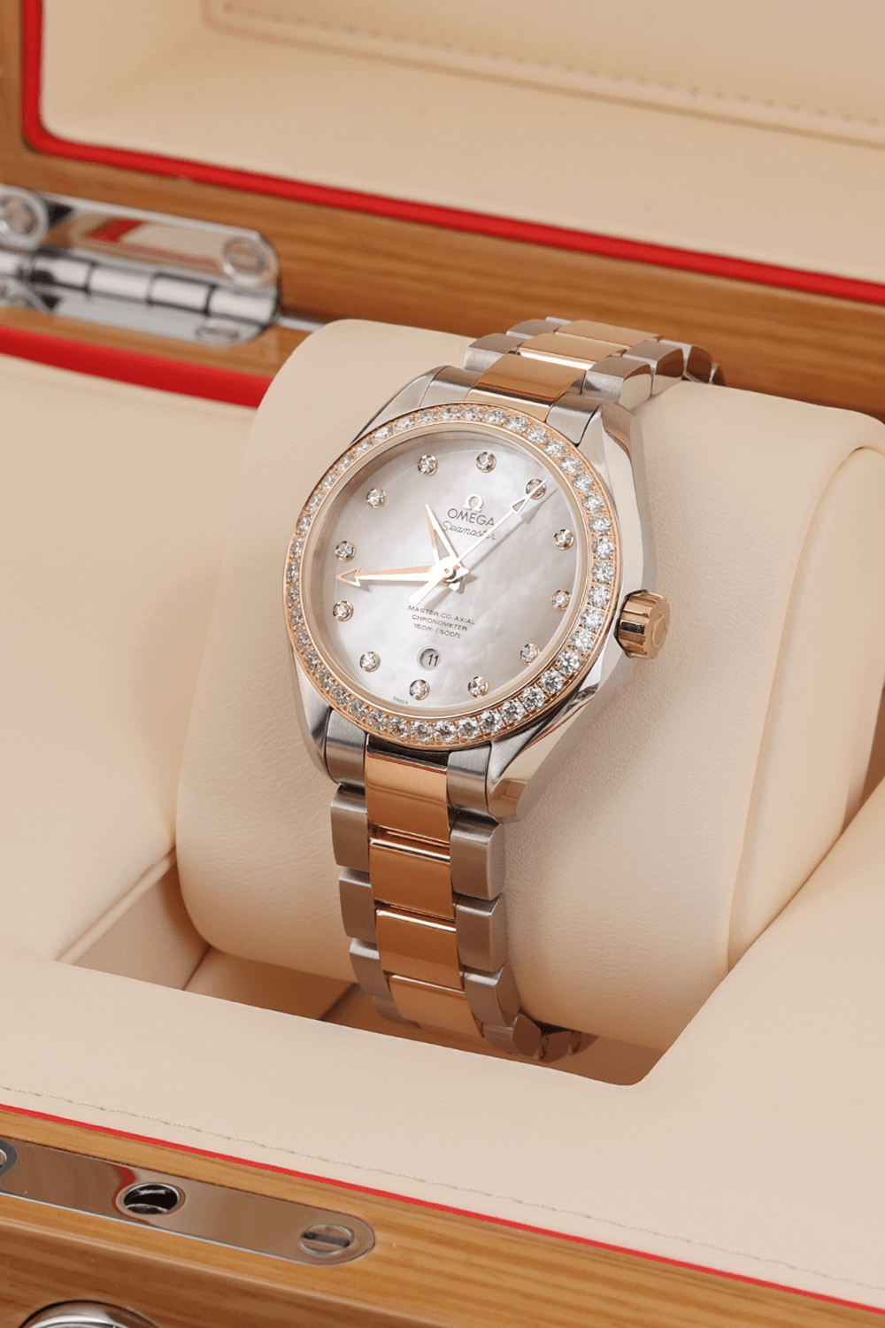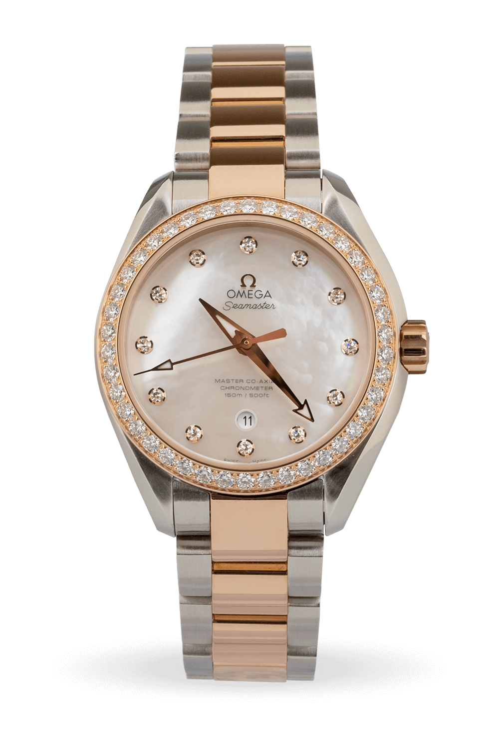 Experience luxury and precision with the Omega Seamaster Aqua Terra 231.25.34.20.55.005. This stunning watch features a 34mm stainless steel case and an 18k rose gold bracelet. Additionally, it has a diamond bezel that provides a timeless and classic look. Moreover, the white mother-of-pearl dial with diamond markers exudes sophistication, making it a versatile accessory that can elevate any outfit.
