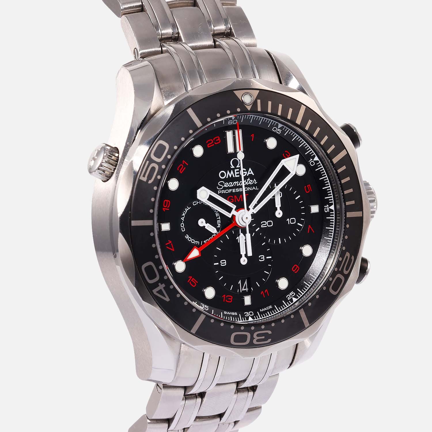 The black dial of the Omega Seamaster Diver 300M GMT is adorned with round index markers, offering exceptional legibility even in low-light conditions. Encased in durable stainless steel, this timepiece exudes sophistication and strength.