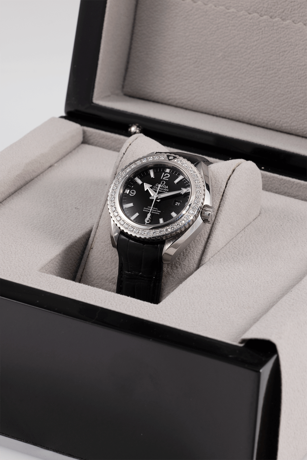 The Omega Seamaster Planet Ocean (232.18.38.20.01.001) is a watch that combines style and performance. It boasts a 37.5mm stainless steel case that holds the self-winding Omega Co-Axial Calibre 8520 with a 50-hour power reserve.