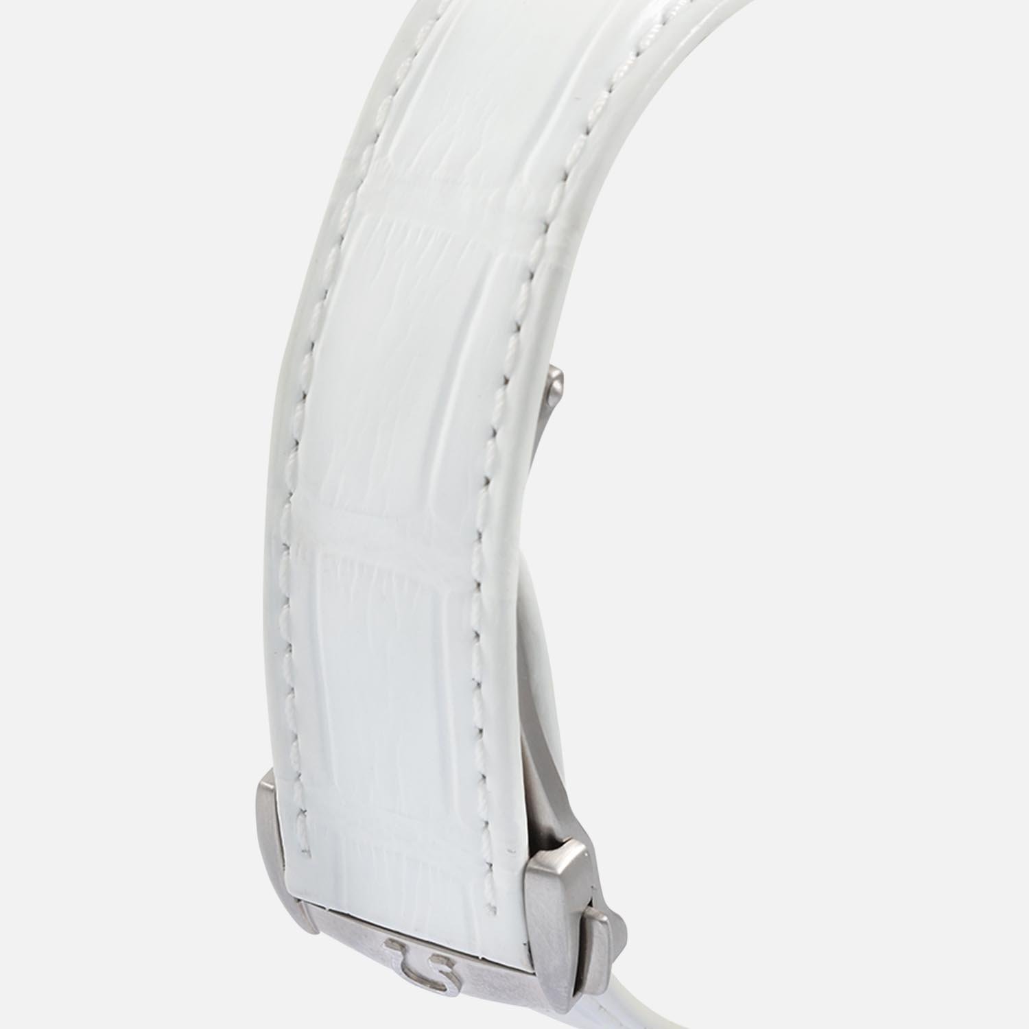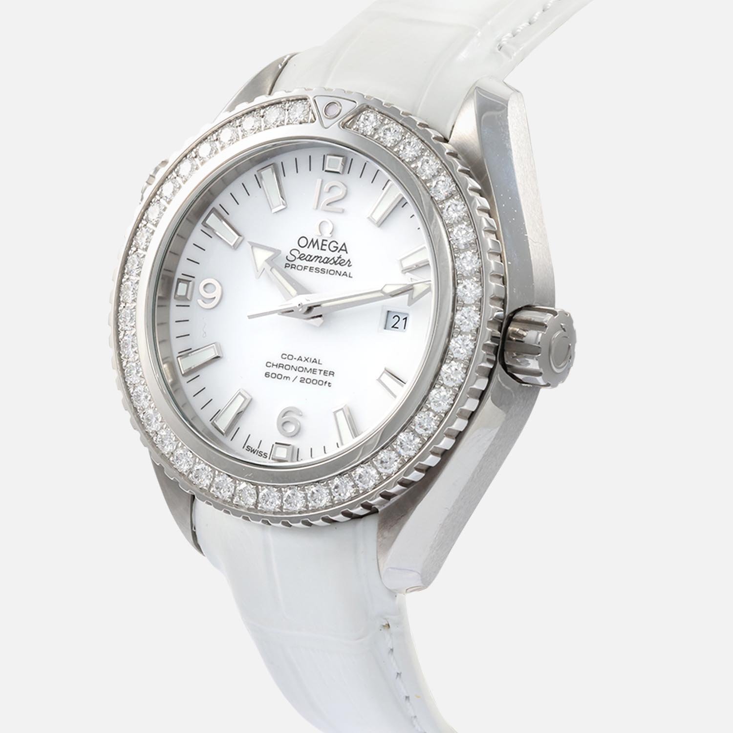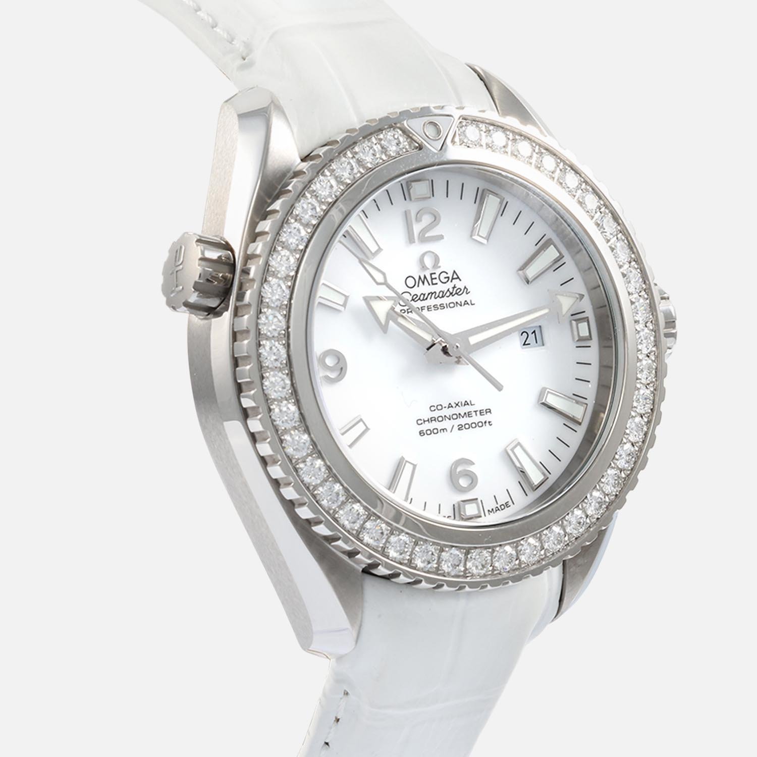 The Omega Seamaster Planet Ocean 232.18.38.20.04.001 combines style and performance. This watch boasts a 38mm stainless steel case that holds the self-winding Omega Caliber 8520 with a 50-hour power reserve. The white dial displays white hands, hour markers, and a date window at 3 o’clock, with a stunning diamond-set bezel.