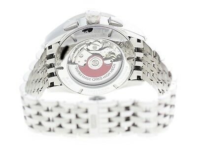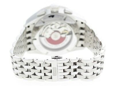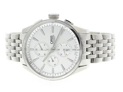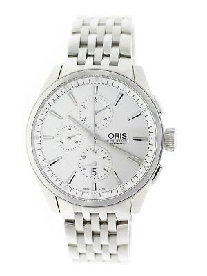 Stainless Steel Oris Artix automatic watch with a 44mm case, silver dial, and stainless steel bracelet with double push-button dual foldover deployment. Features include hours, minutes, seconds, date, and chronograph. Comes with a Deluxe Gift Box and 2 Year Precision Watches Store Warranty.