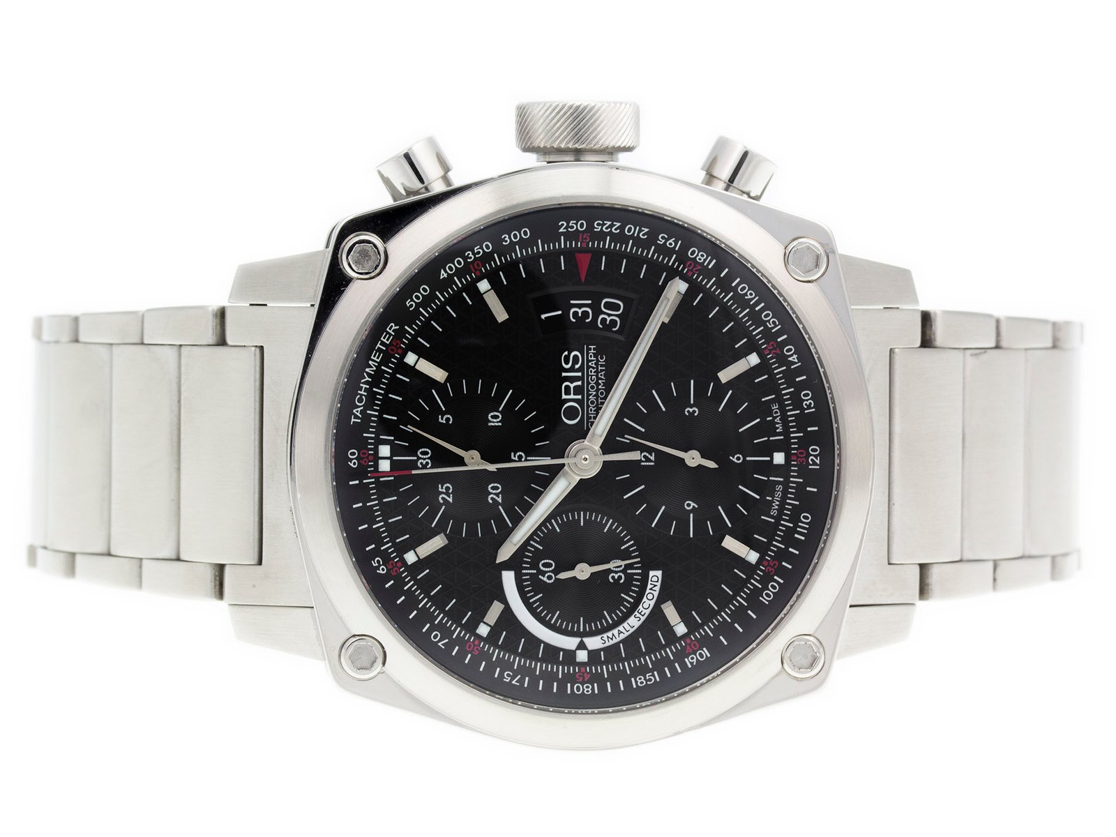 Stainless Steel Oris BC$ Chronograph Automatic Watch with a 43mm case, Black dial, and Stainless Steel Bracelet with Lift Lever Foldover Deployment Buckle. Features include Hours, Minutes, Seconds, Date, Chronograph, and Tachymeter. Water resistant up to 100 meters/330feet. Comes with a Deluxe Gift Box and 2 Year Precision Watches Store Warranty.​