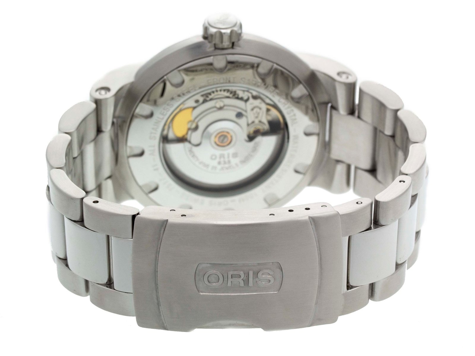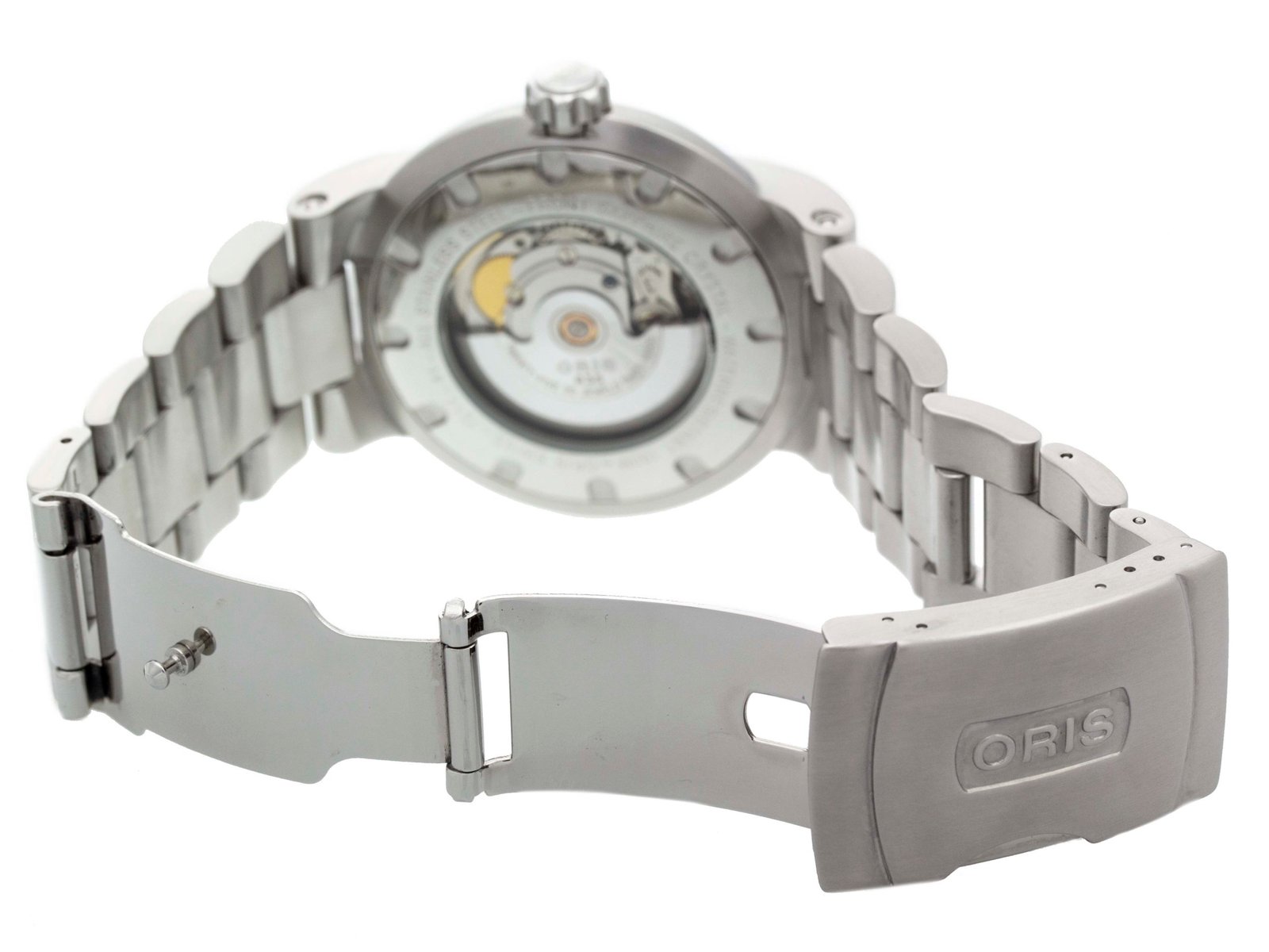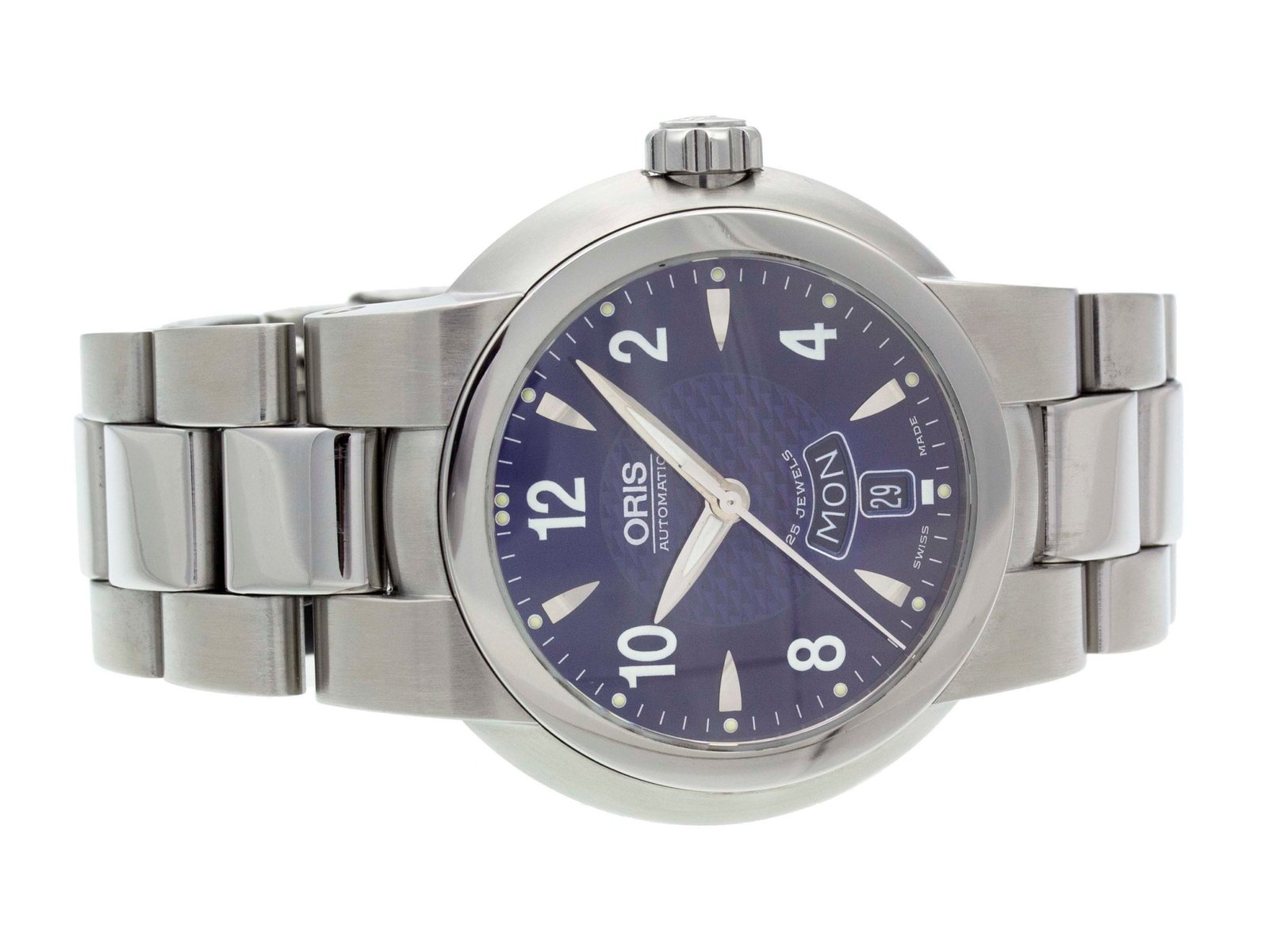 Stainless steel Oris Diver automatic watch with a 42mm case, blue dial, and steel bracelet with deployment buckle. Features include hours, minutes, seconds, day, and date. Comes with a Deluxe Gift Box and 2 Year Precision Watches Store Warranty.​