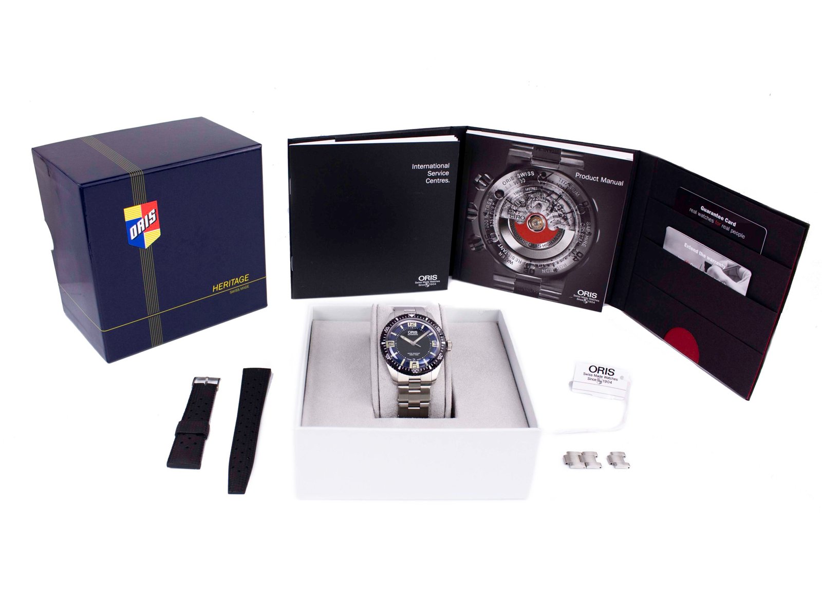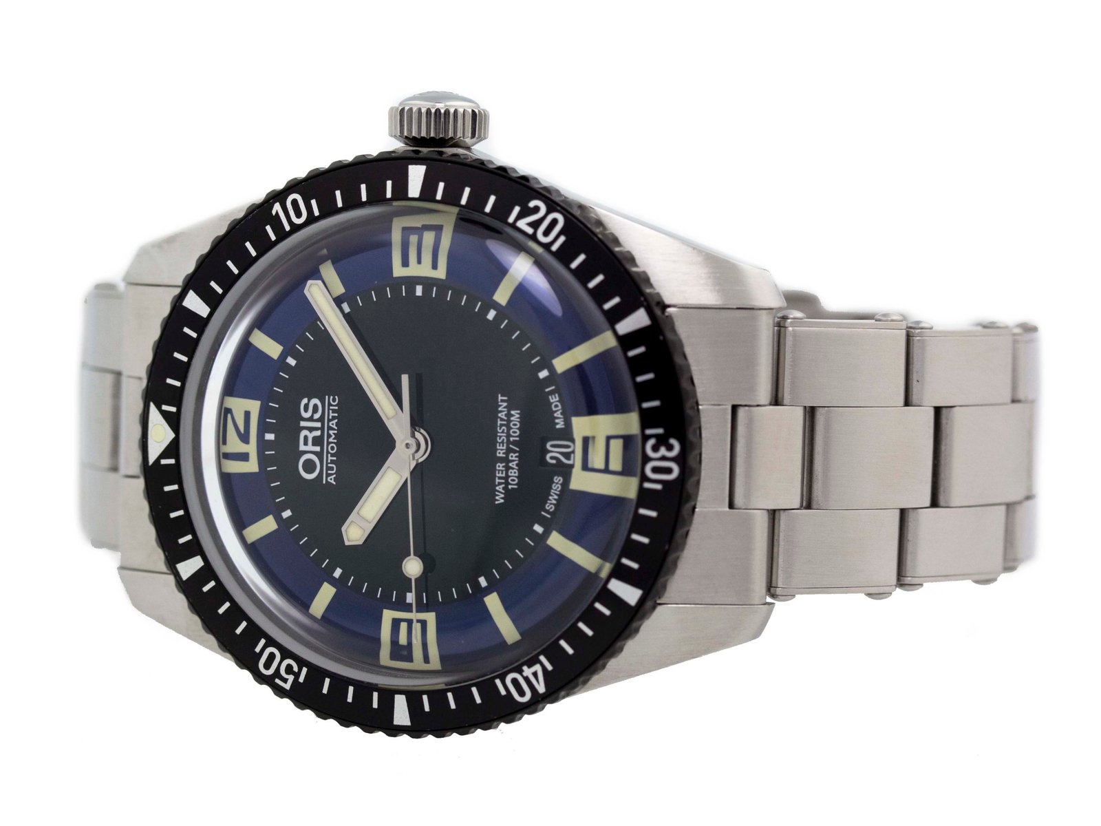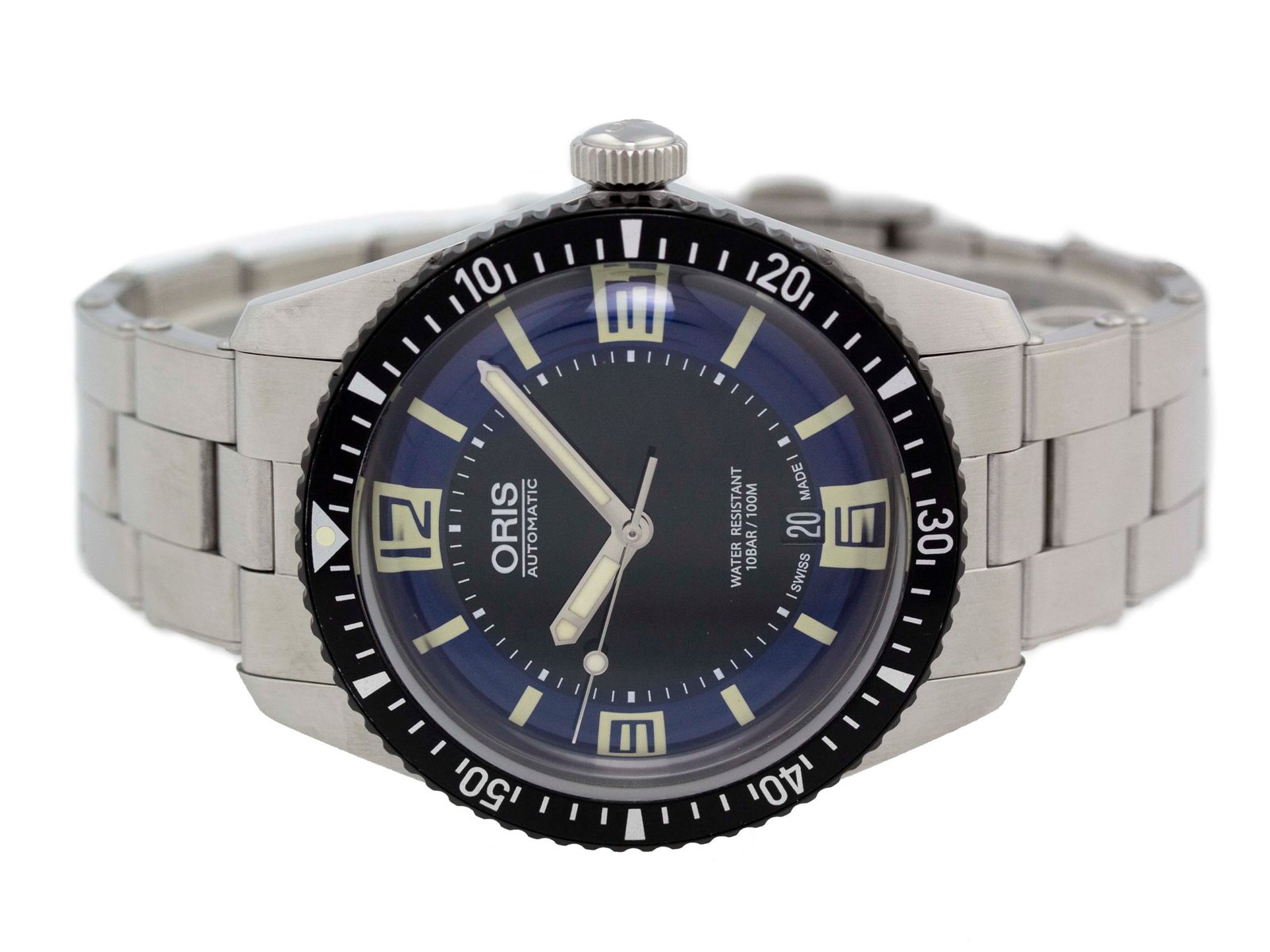 Oris – Divers Sixty-Five – 40MM – Stainless Steel – Uni-directional Rotating Black DLC Bezel – Black/Blue Stick w/ Arabic Numerals mark the 3, 6, 9 and 12 o’clock positions. Date On 6 Dial – Stainless Steel Bracelet – Yes/Yes