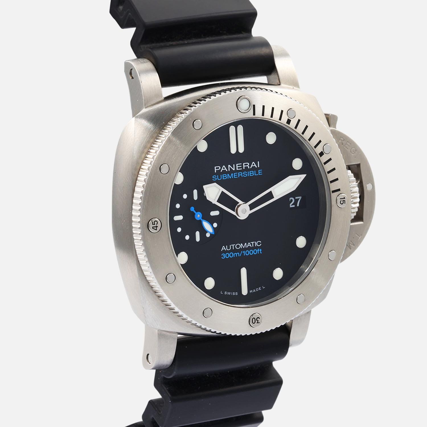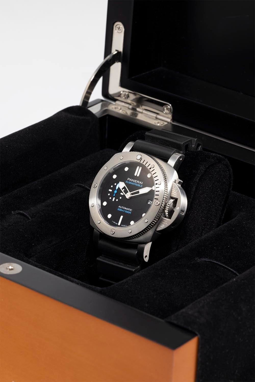 With a 300m/1000ft water resistance, it’s perfect for diving or any other water-based activity. The Panerai Submersible PAM00973 comes with a Panerai box with original papers, and a 2-year Precision Watches Warranty, providing added peace of mind. Whether you’re a watch collector or simply looking for a reliable and stylish timepiece, the Panerai Submersible PAM00973 is an excellent choice that won’t disappoint.
