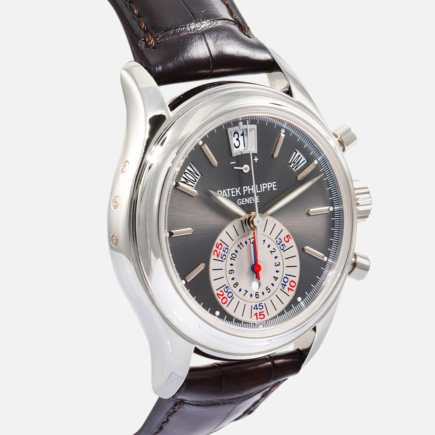 Introducing the Patek Philippe Annual Calendar Chronograph 5960P-001, a remarkable timepiece that embodies luxury and sophistication. With a 40.5mm platinum case and fixed bezel, this watch offers a timeless and classic look. The gray dial with index markers adds a touch of sophistication to its design, making it a versatile accessory that can elevate any outfit.