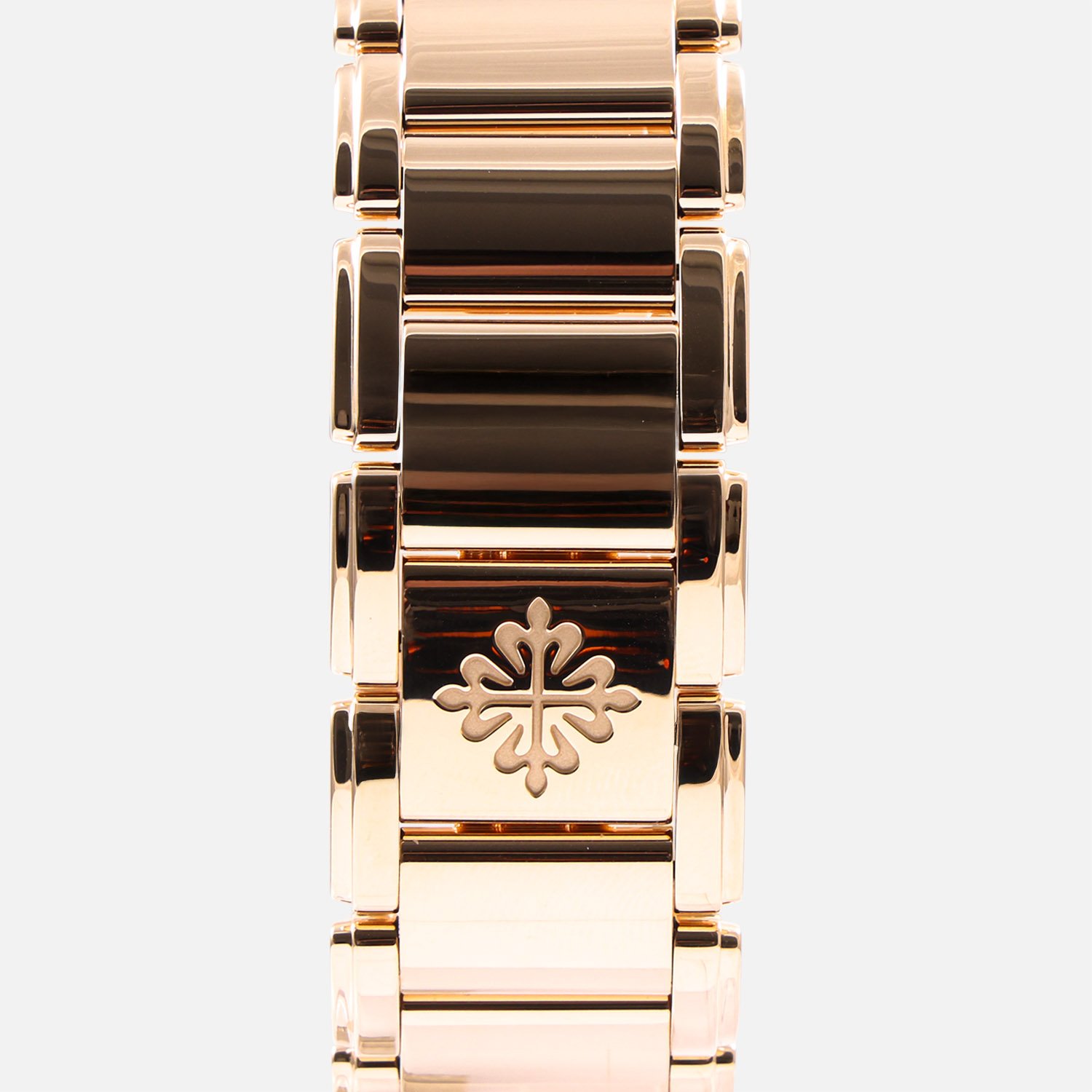 The Patek Philippe Twenty4 Ref. 4910/11R-011 is a refined ladies’ timepiece that embodies the brand’s dedication to timeless design and exceptional craftsmanship. Introduced to commemorate the 25th anniversary of the Twenty4 collection, this model features a distinctive rectangular rose gold case adorned with brilliant-cut diamonds, enhancing its sophisticated appeal.