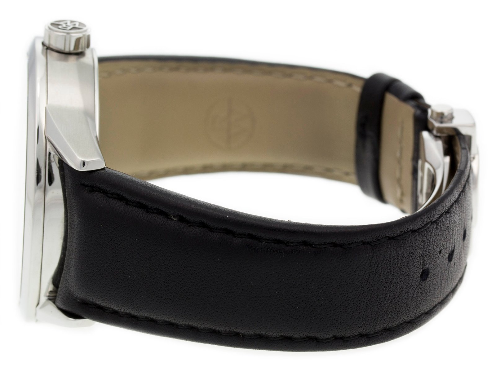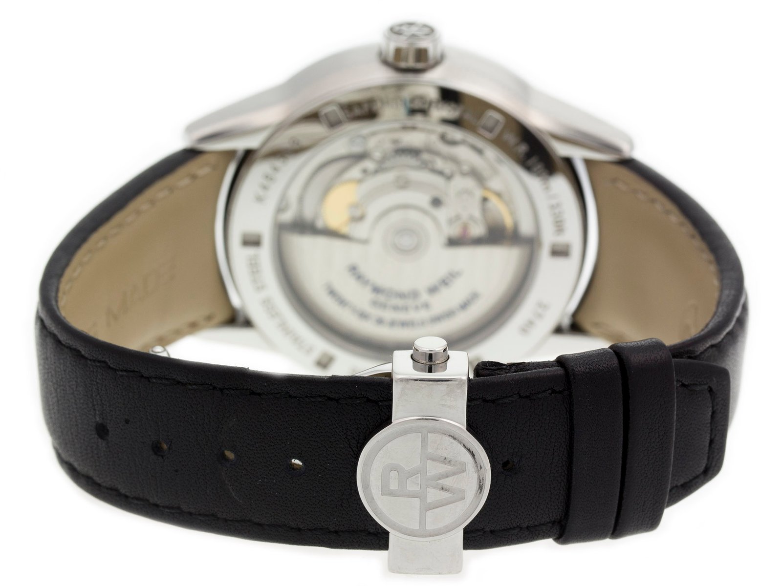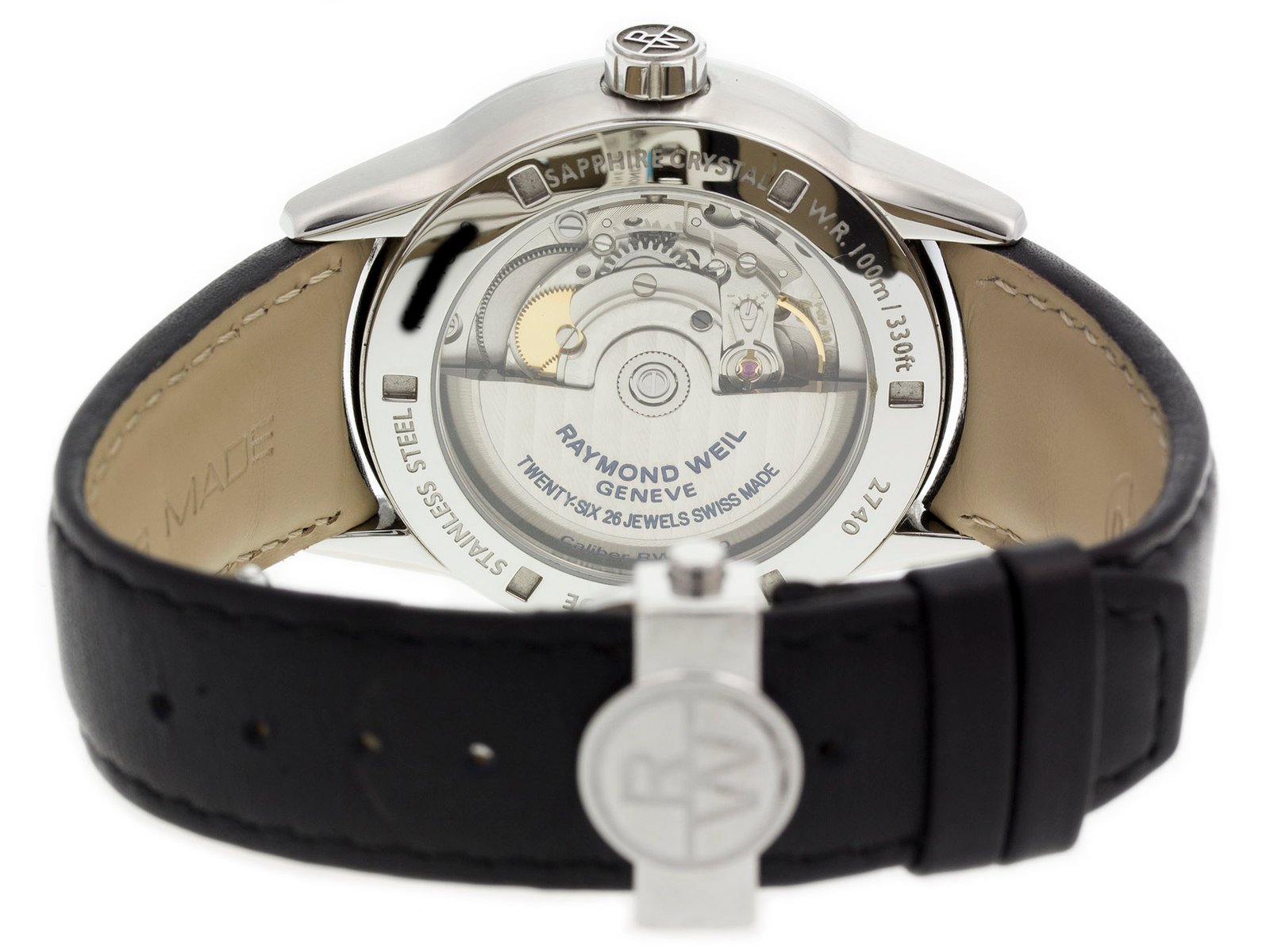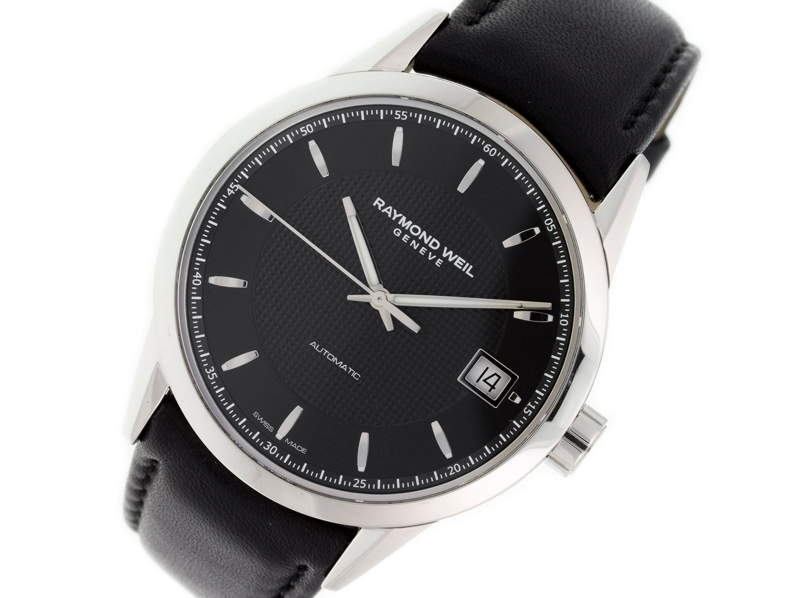 Stainless steel Raymond Weil Freelancer swiss automatic watch with a 42.5mm case, black dial, and black leather strap with double push-button foldover deployment buckle. Features include hours, minutes, seconds, and date. Comes with a Deluxe Gift Box, Hang Tag and 2 Year Precision Watches Store Warranty.