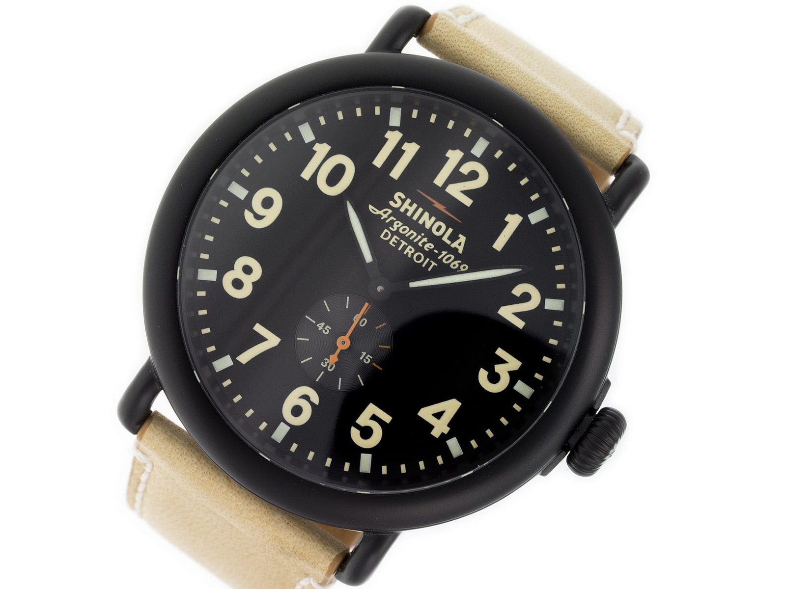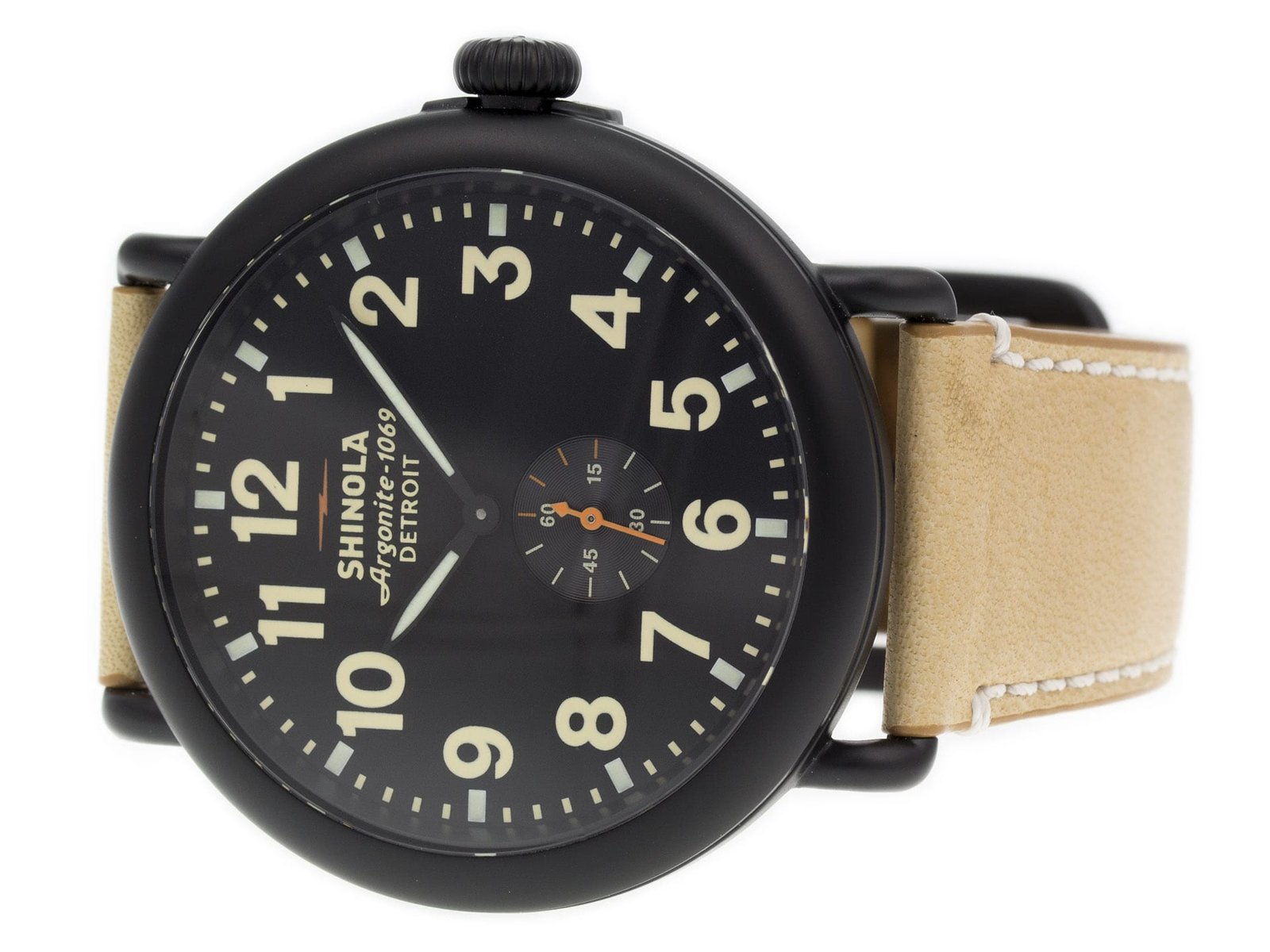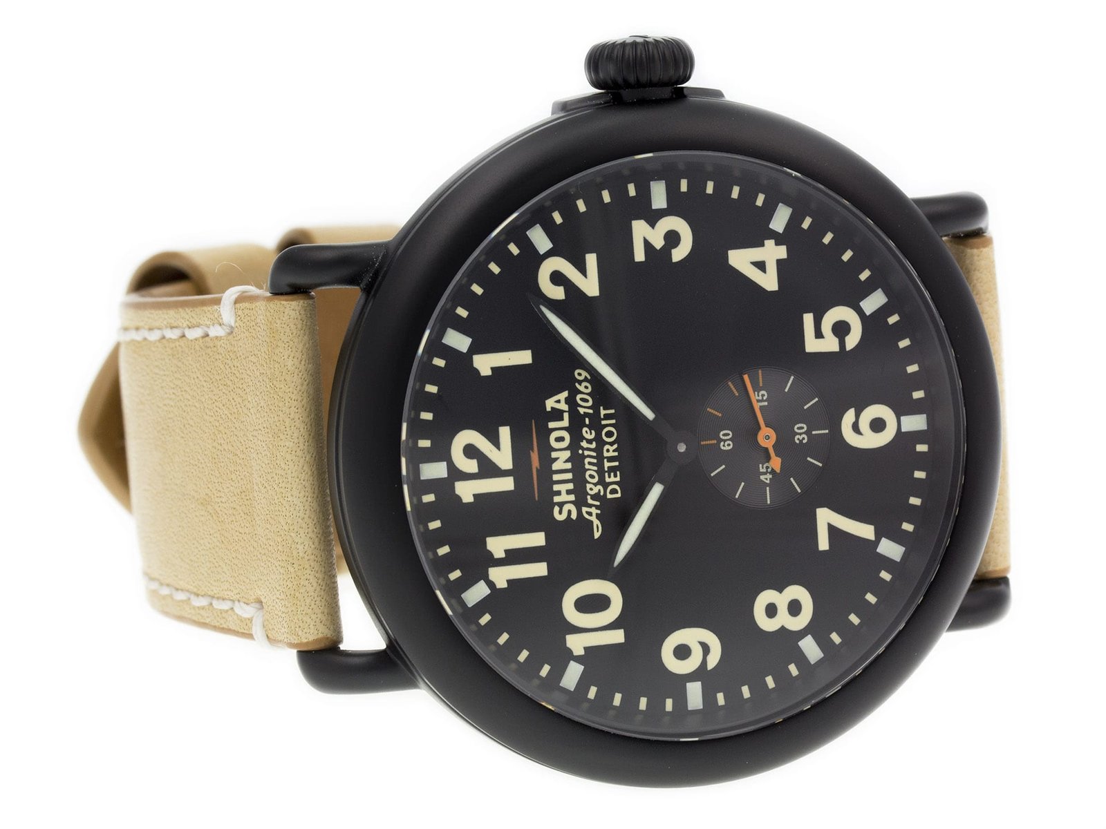 Black PVD Steel Shinola The Runwell Chrono 10000011 watch, water resistant to 50m, with leather strap.