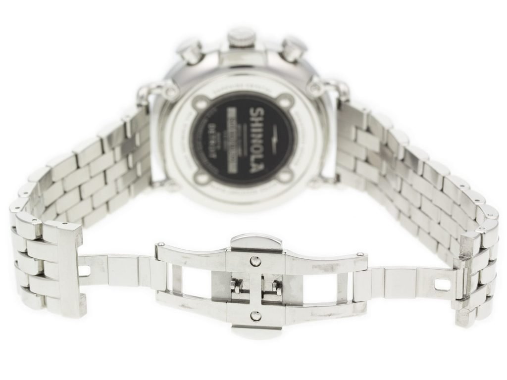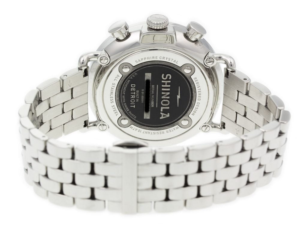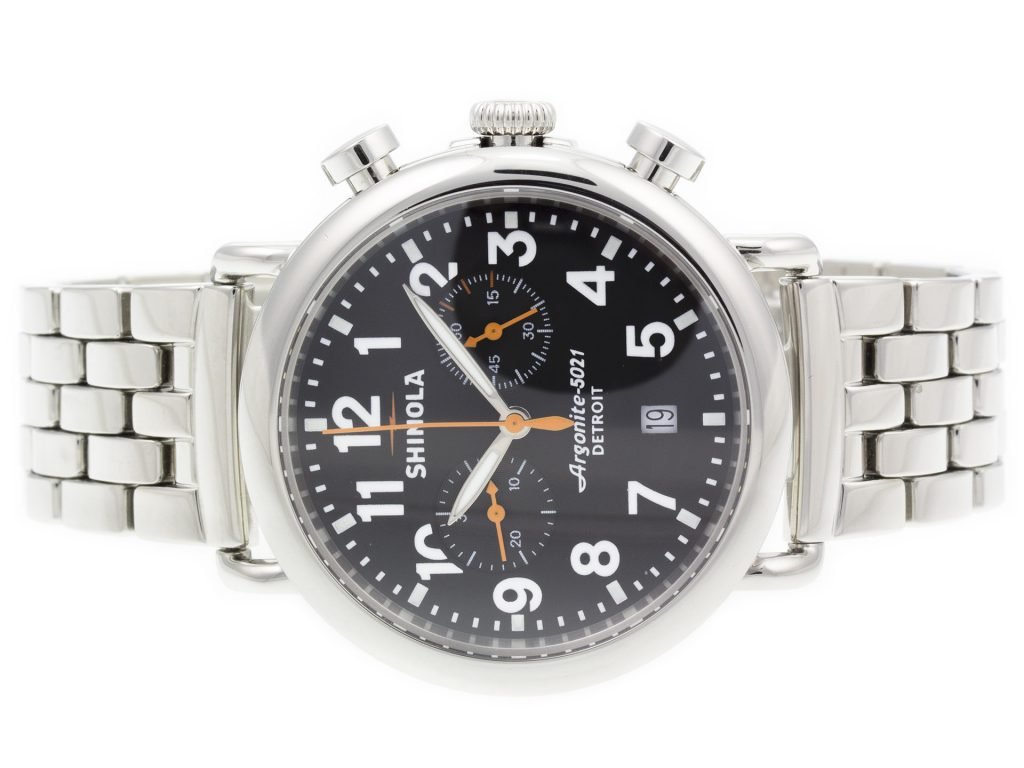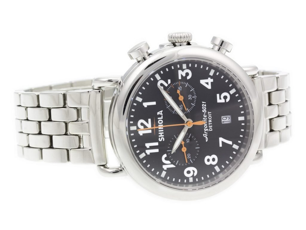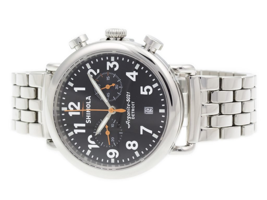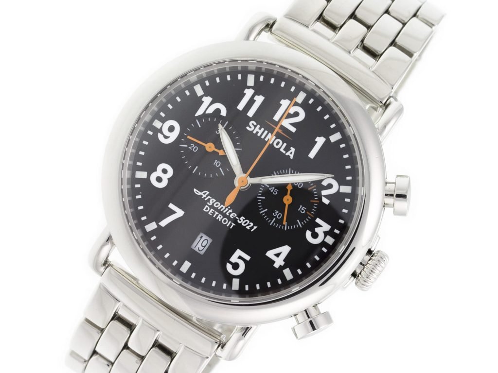 Stainless steel Shinola The Runwell Chrono 10000064 watch, water resistant to 100m, with date, chronograph, and bracelet.