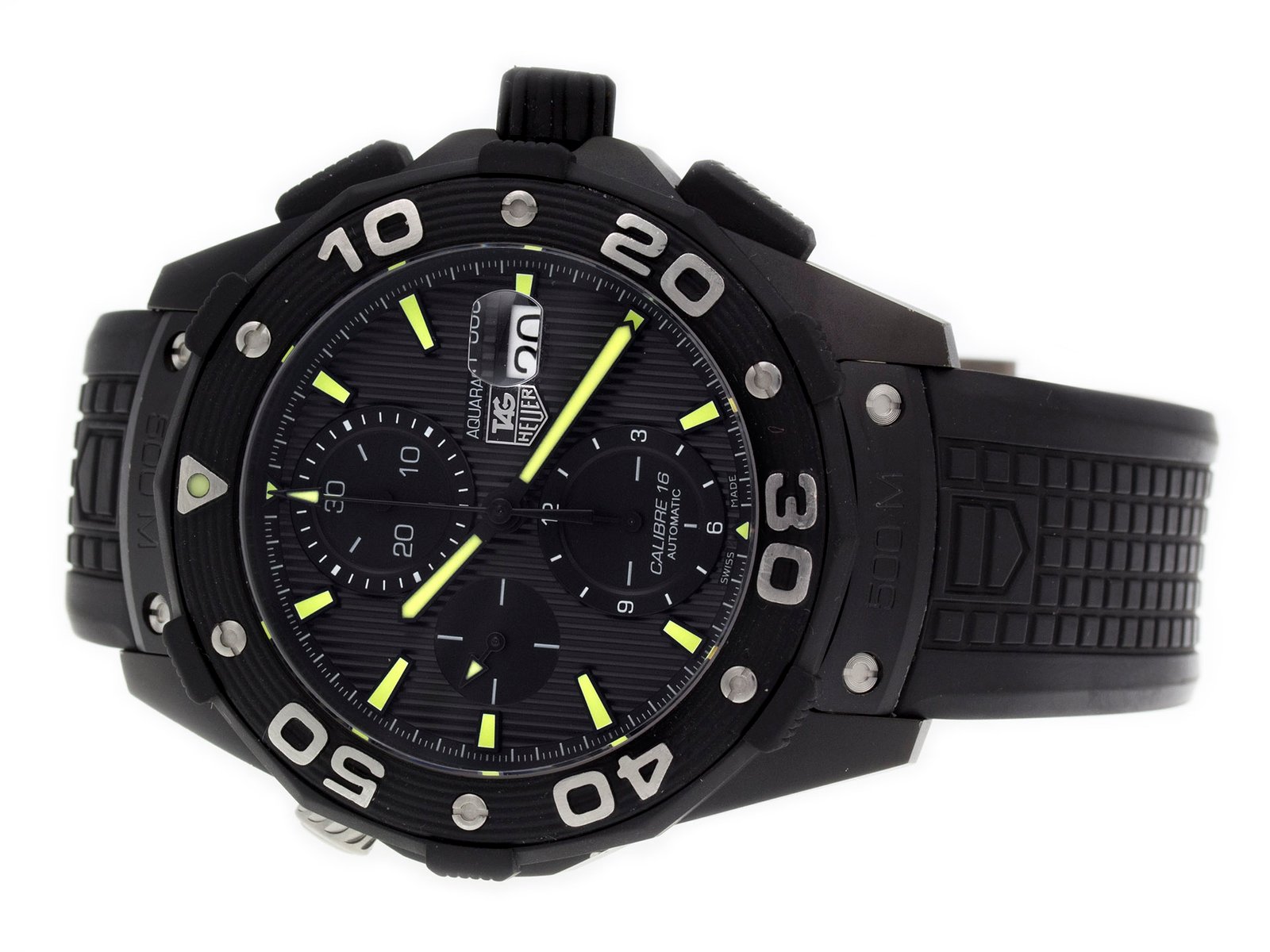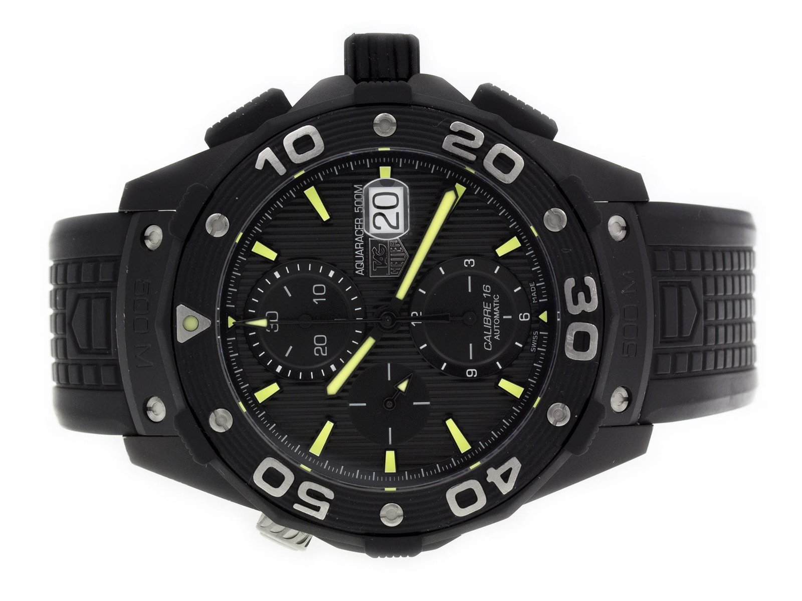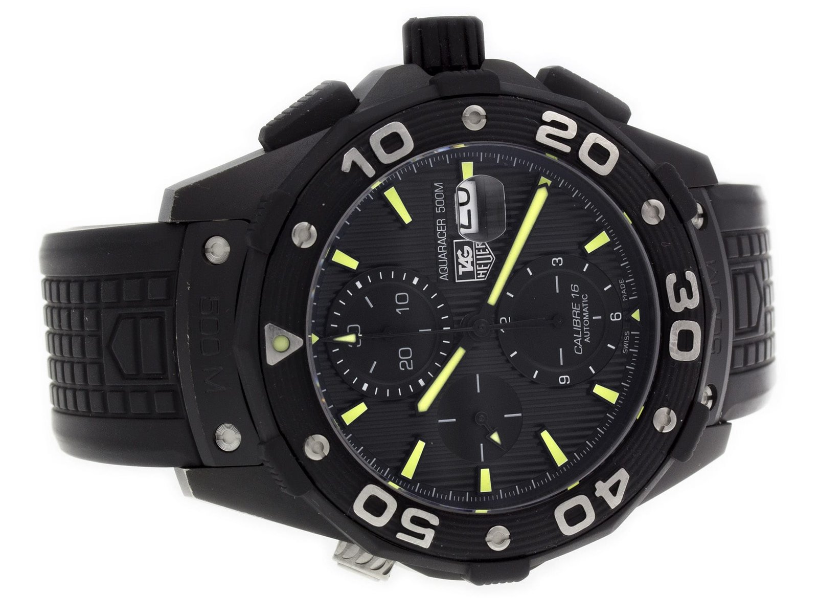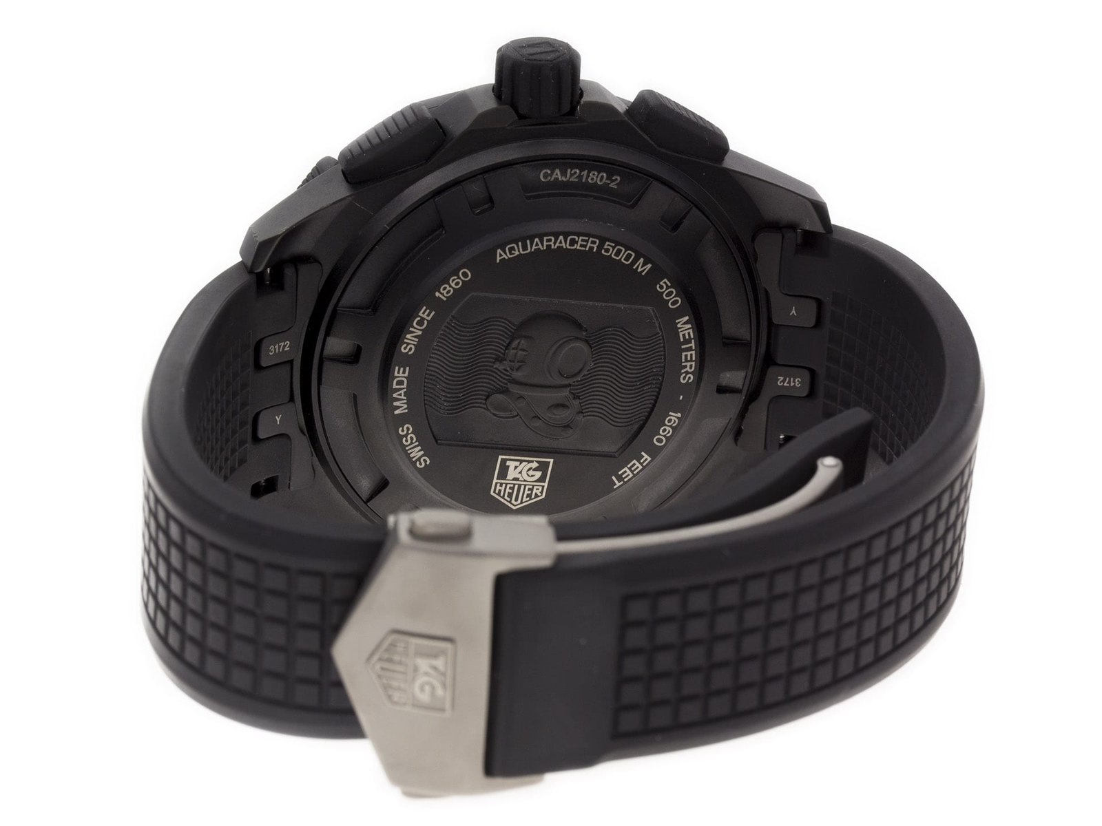 Black PVD Tag Heuer Aquaracer CAJ2180.FT6023 watch, water resistant to 500m, with chronograph, date, and rubber strap.
