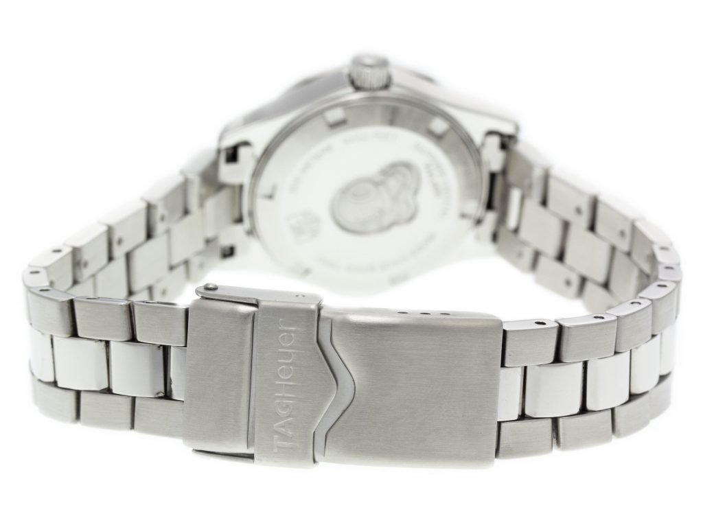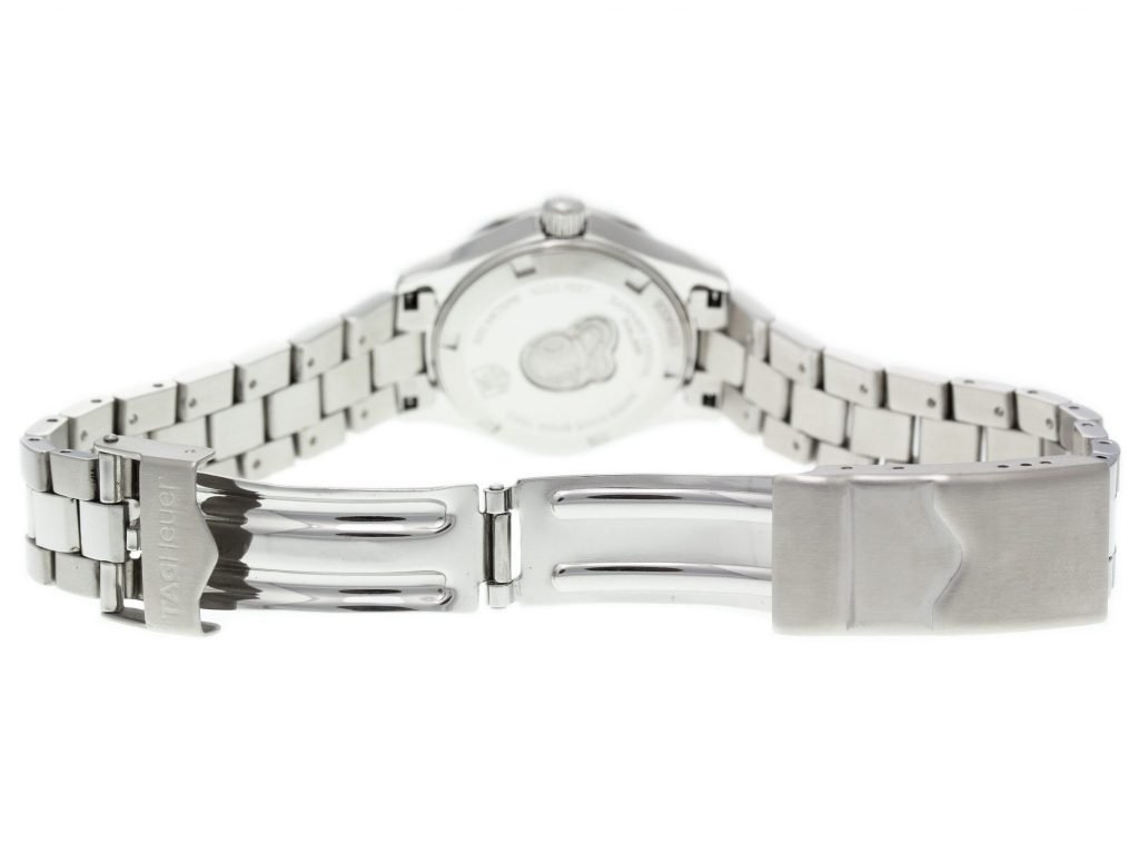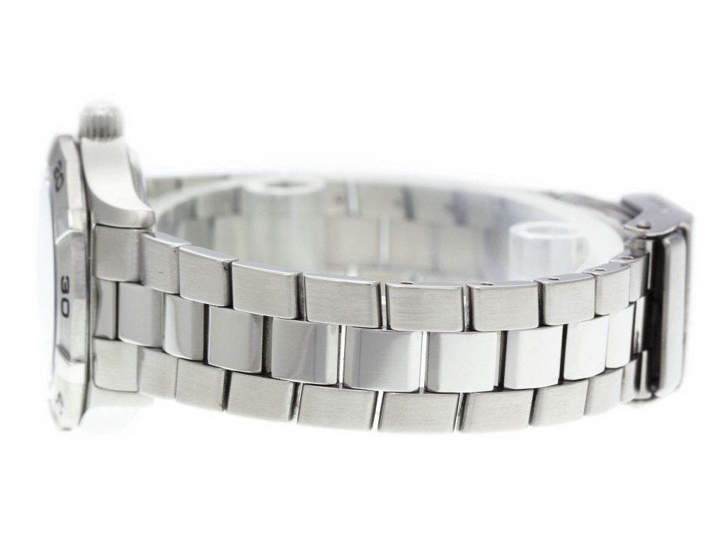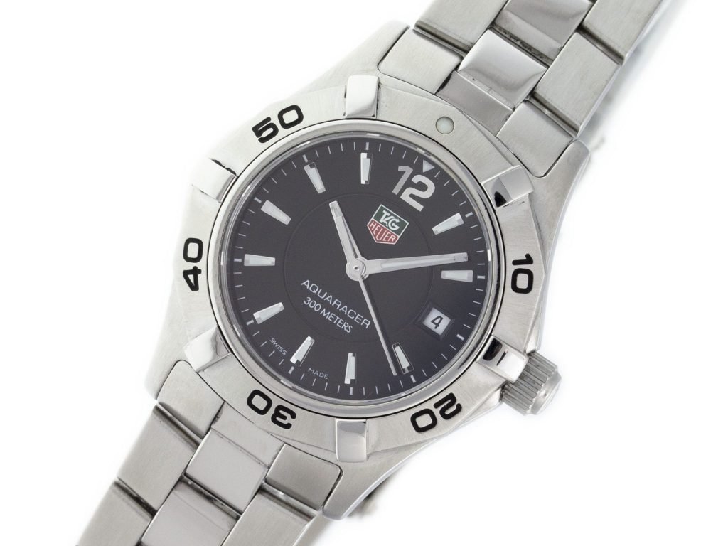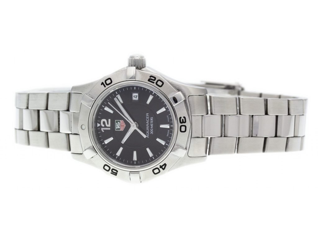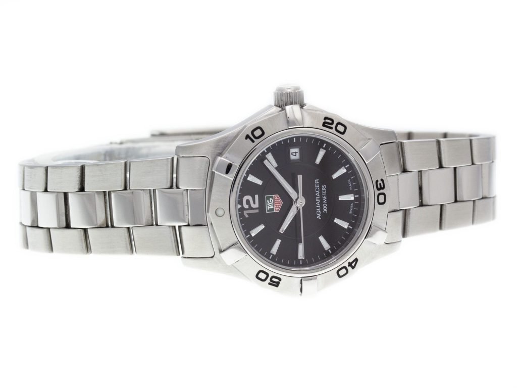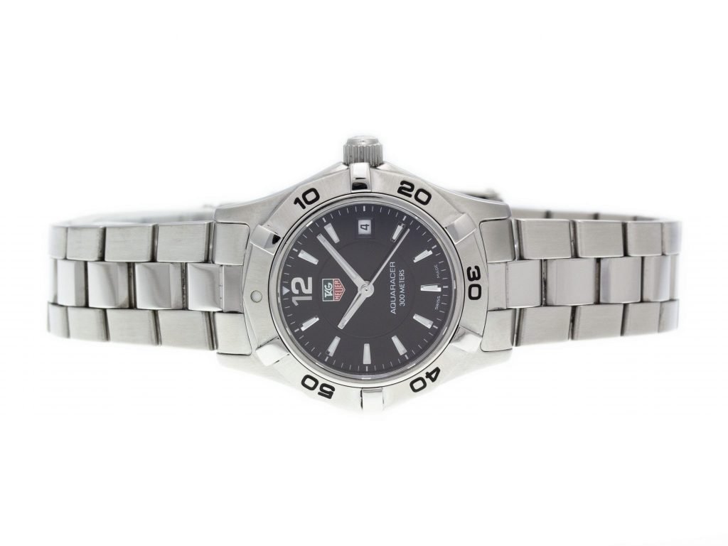 Stainless Steel Tag Heuer Aquaracer Quartz Watch with a 27mm Case, Black Dial, and Bracelet with Folding Clasp. Features include Hours, Minutes, Seconds and Date. Comes with a Tag Box and 2 Year Precision Watches Store Warranty.