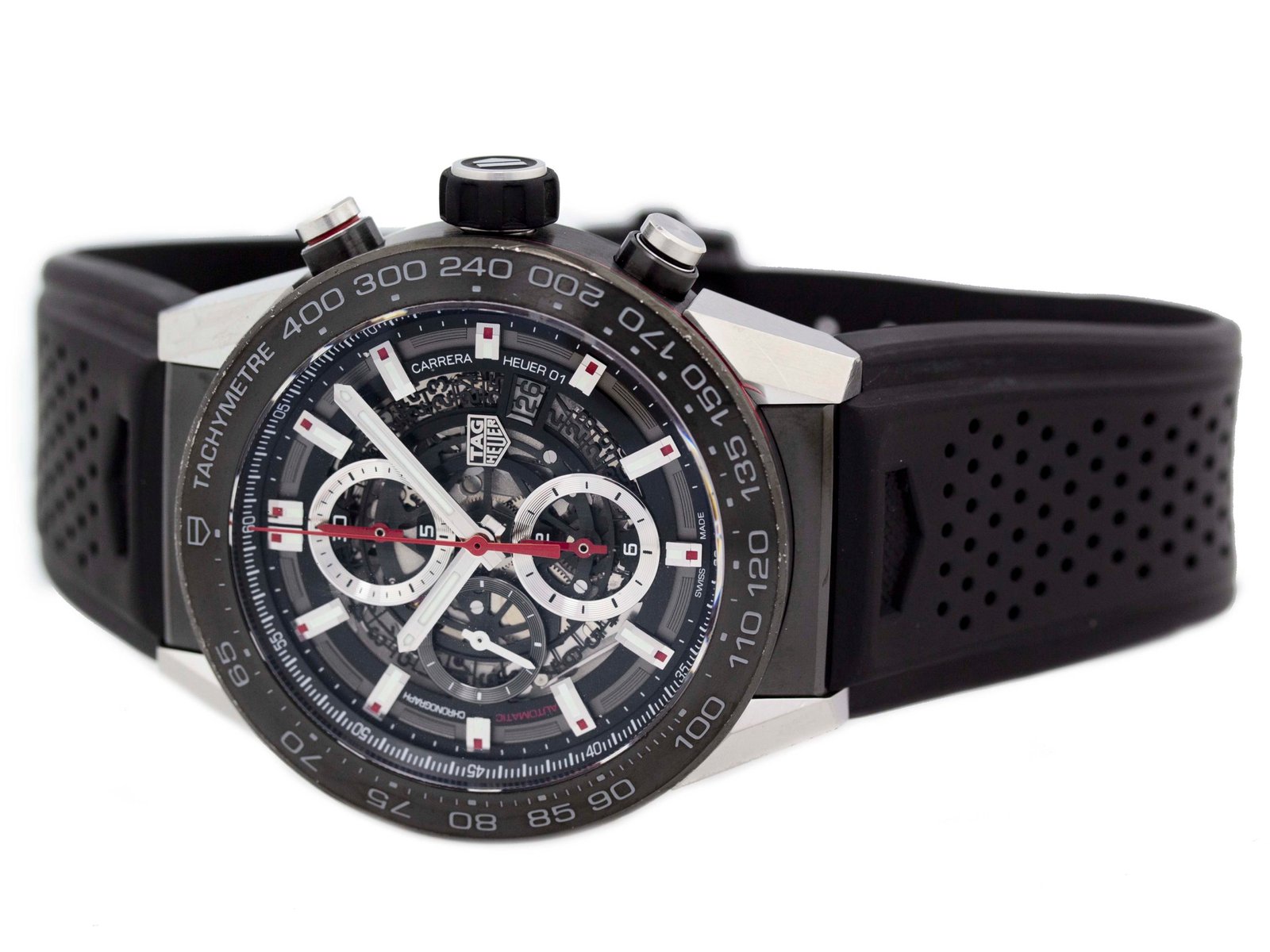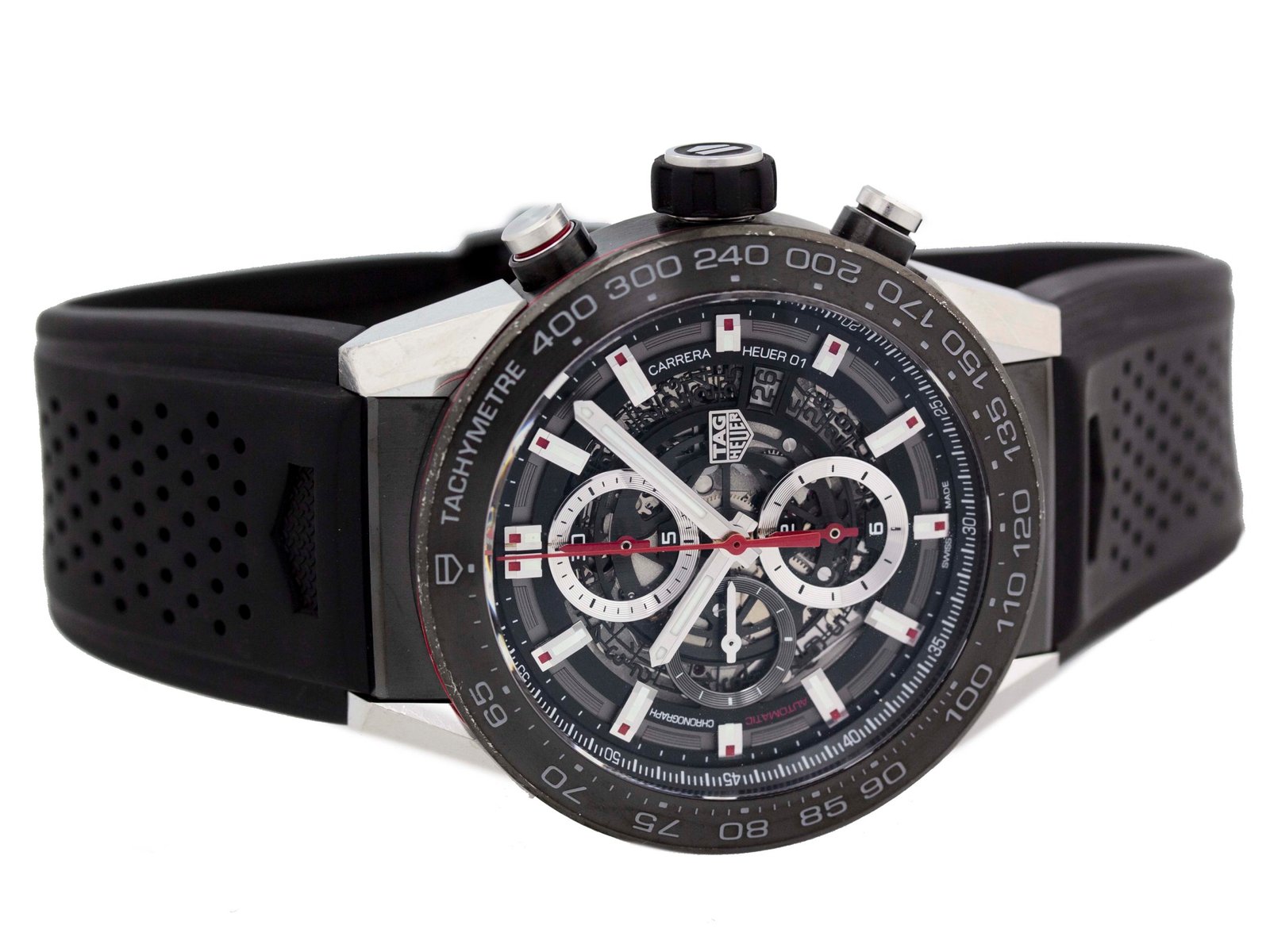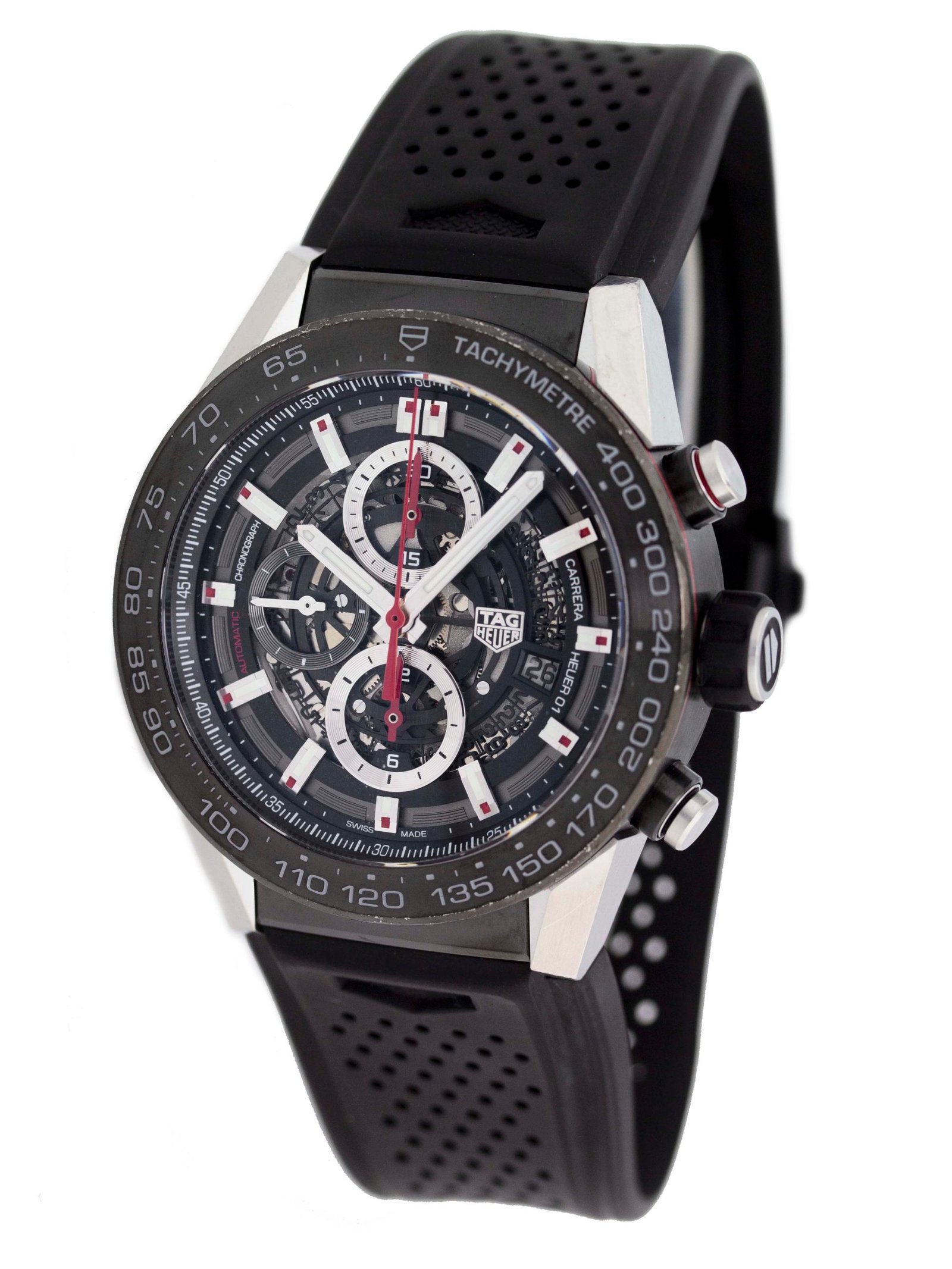 Tag Heuer – Carrera Calibre Heuer 01 – 45MM – Stainless Steel – Fixed Titanium Black Showing Tachymeter Markings Bezel – Black Skeleton Dial – Black Rubber Strap – Yes/Yes – Vendor Style #: CAR2A1Z.FT6044