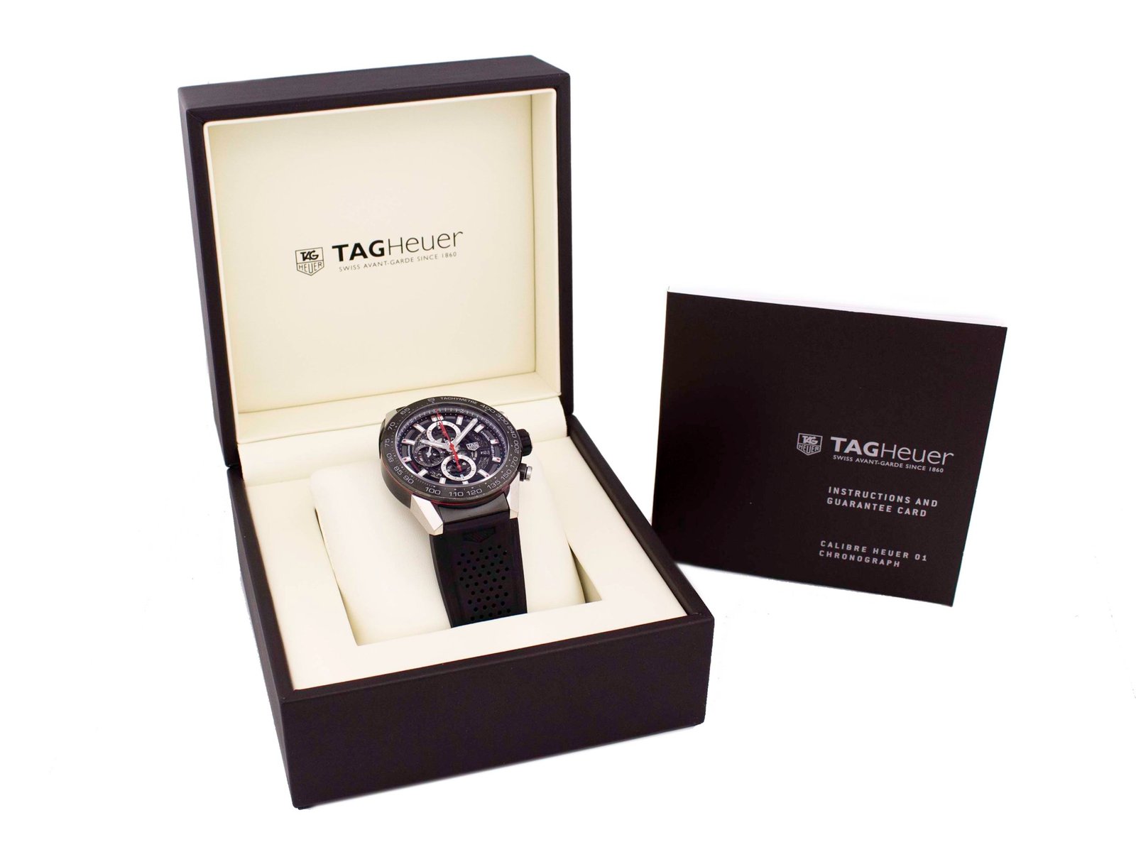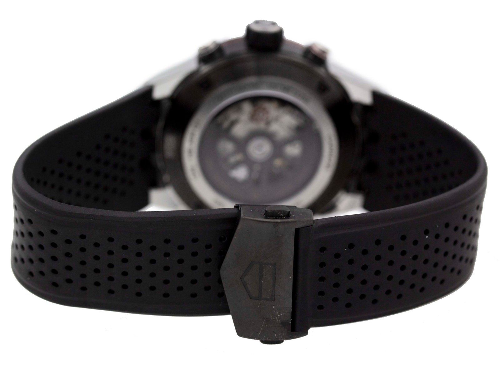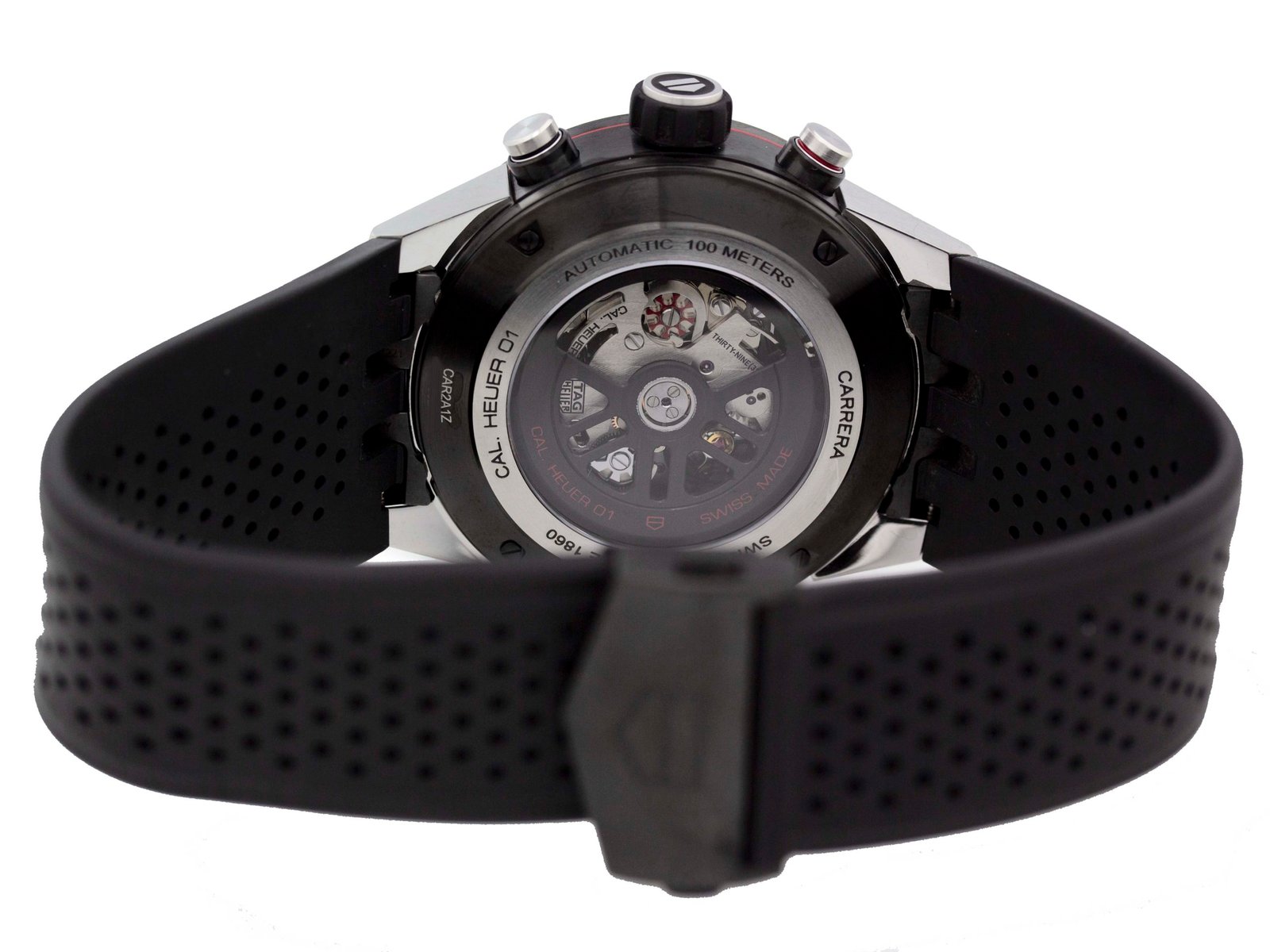 Tag Heuer – Carrera Calibre Heuer 01 – 45MM – Stainless Steel – Fixed Titanium Black Showing Tachymeter Markings Bezel – Black Skeleton Dial – Black Rubber Strap – Yes/Yes – Vendor Style #: CAR2A1Z.FT6044