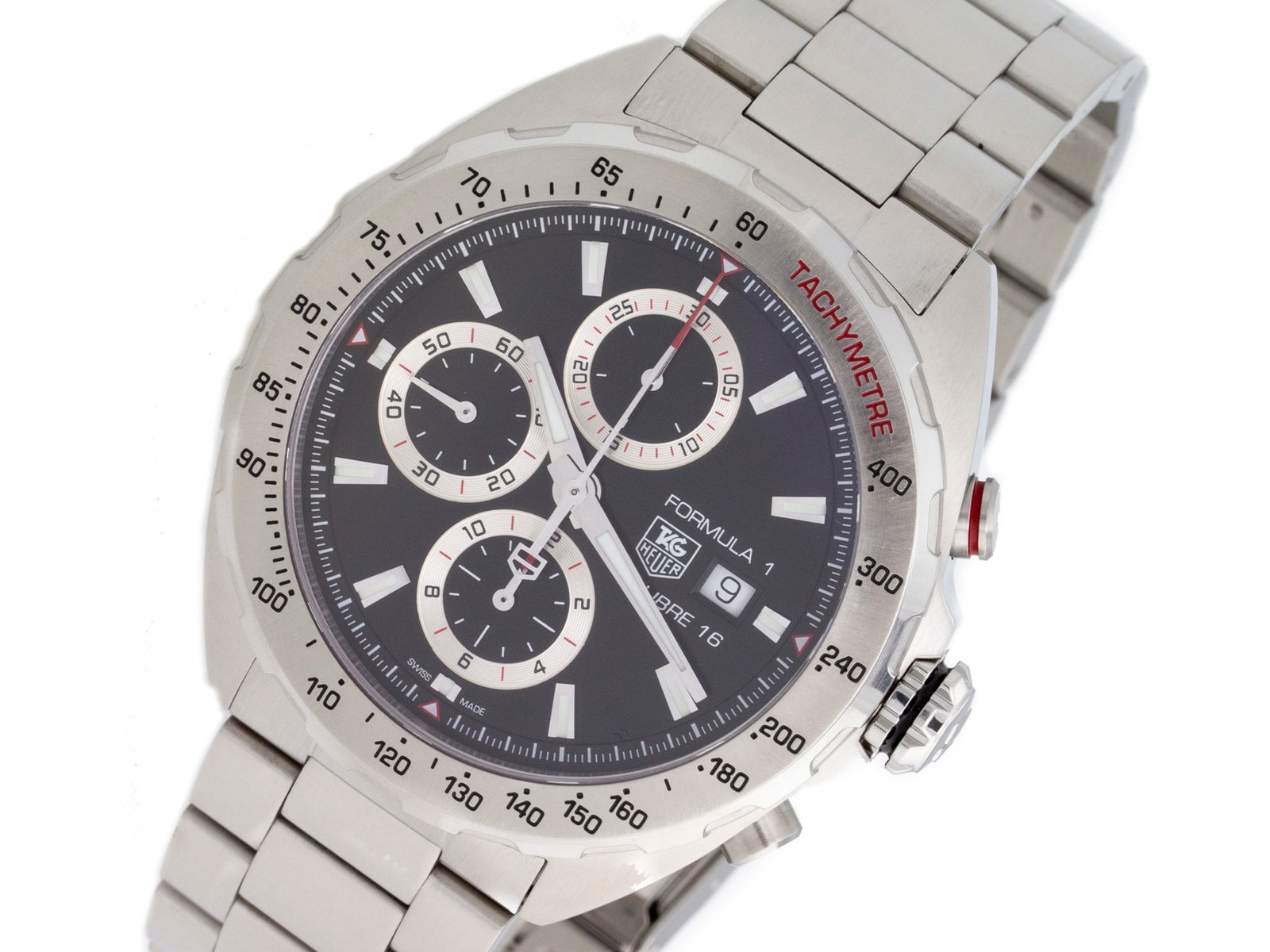 Stainless steel Tag Heuer Formula 1 automatic watch with a 44mm case, black dial, and steel bracelet with folding clasp. Features include hours, minutes, seconds, date, and chronograph. Comes with Tag Box & Manual and 2 Year Precision Watches Store Warranty.​