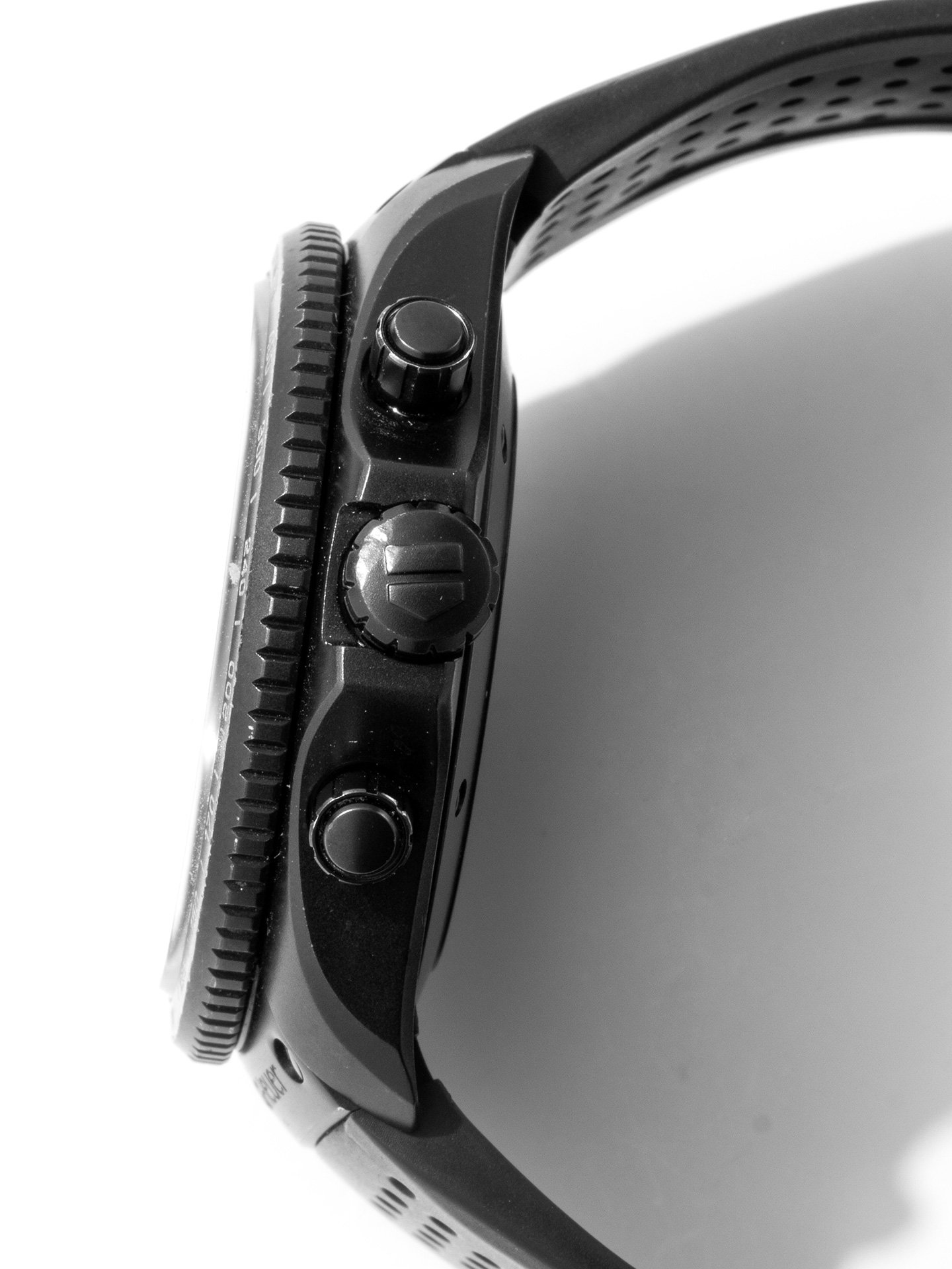 PVD Titanium Tag Heuer CAV518B.FT6016 watch, water resistance to 100m, with date, chronograph, tachymeter, and rubber strap.