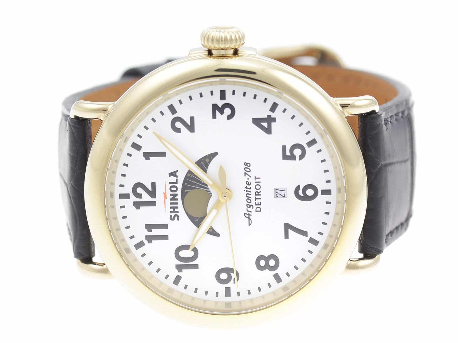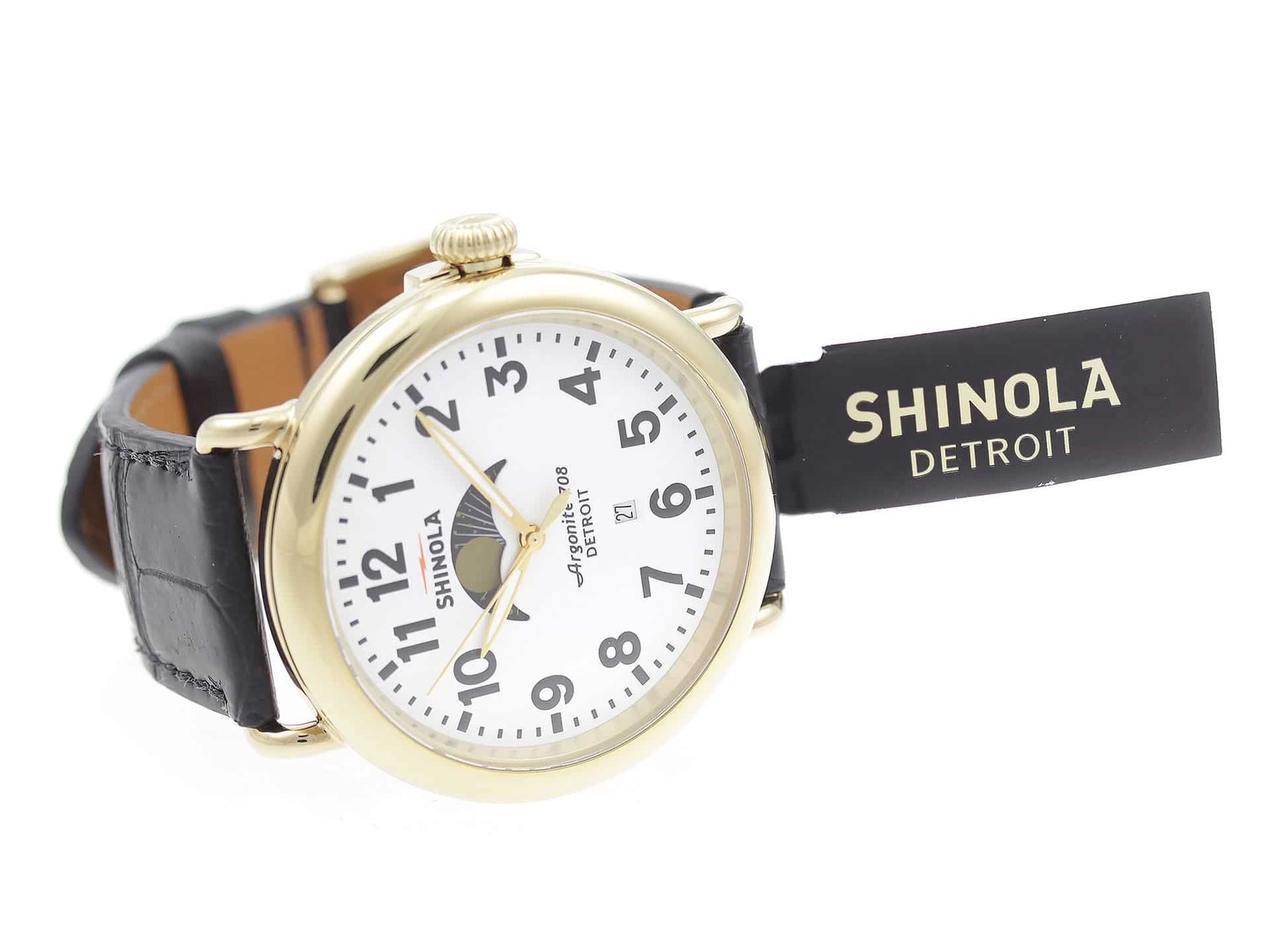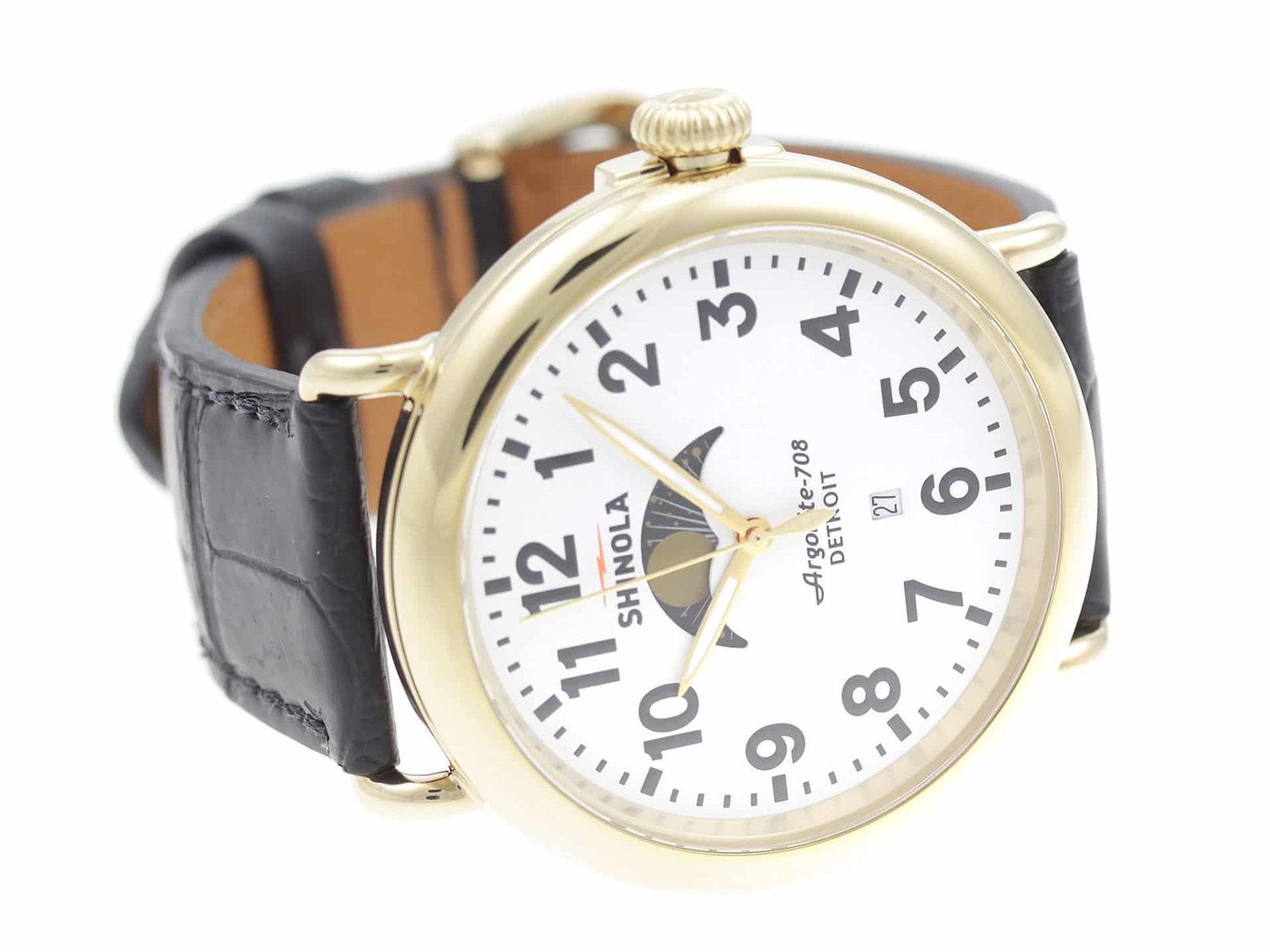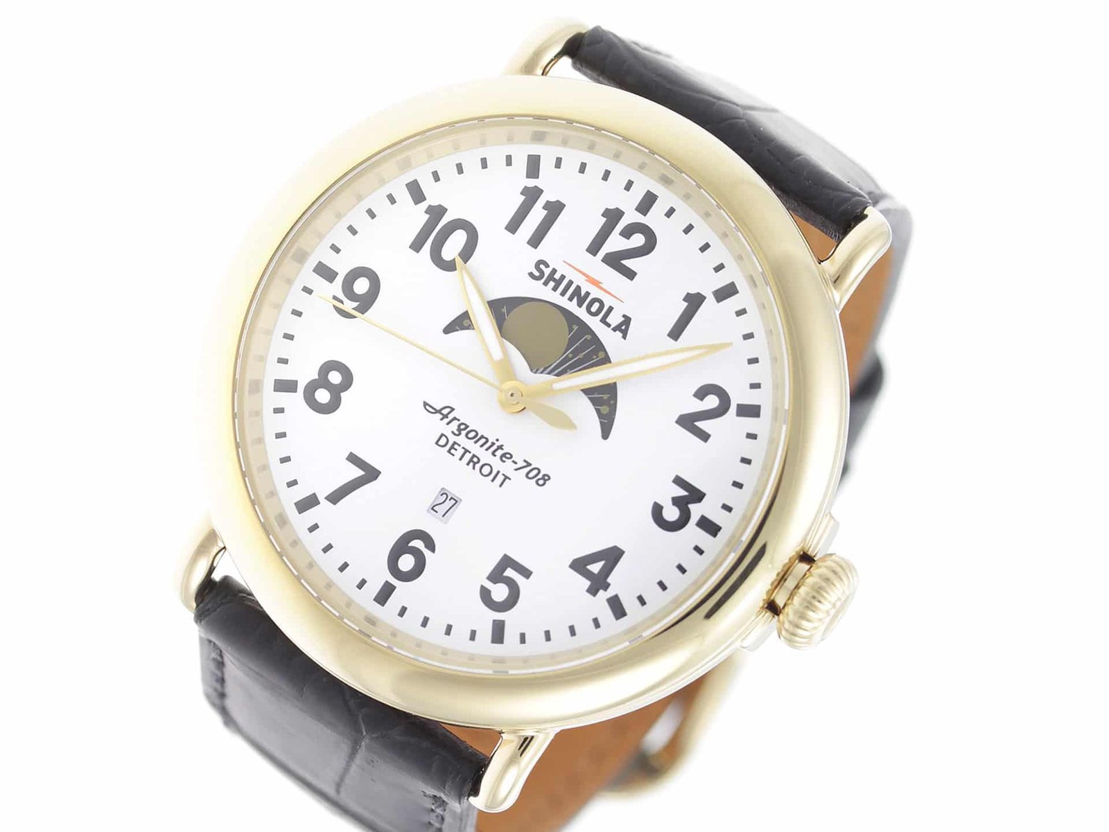 Gold PVD stainless steel case, on black leather strap Shinola The Runwell Moon Phase 47mm 10000180 men’s watch with white dial.