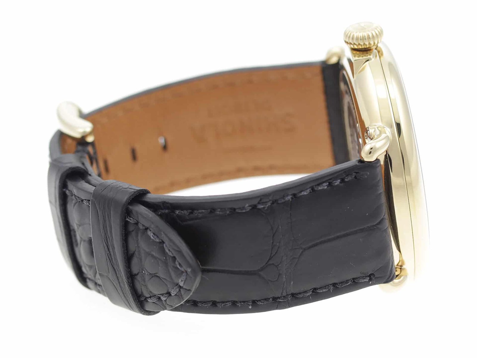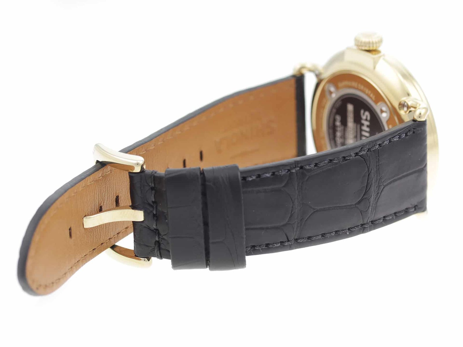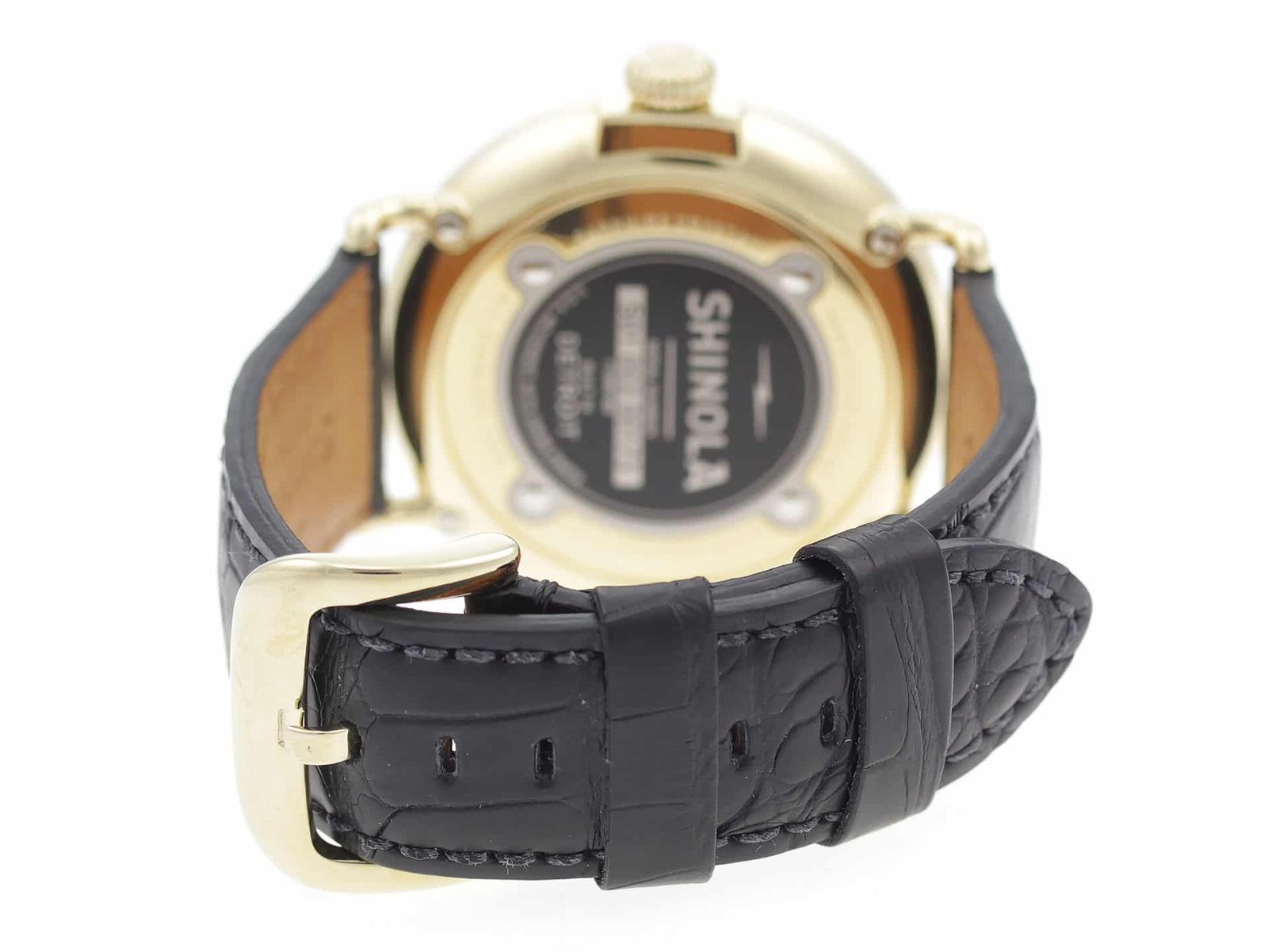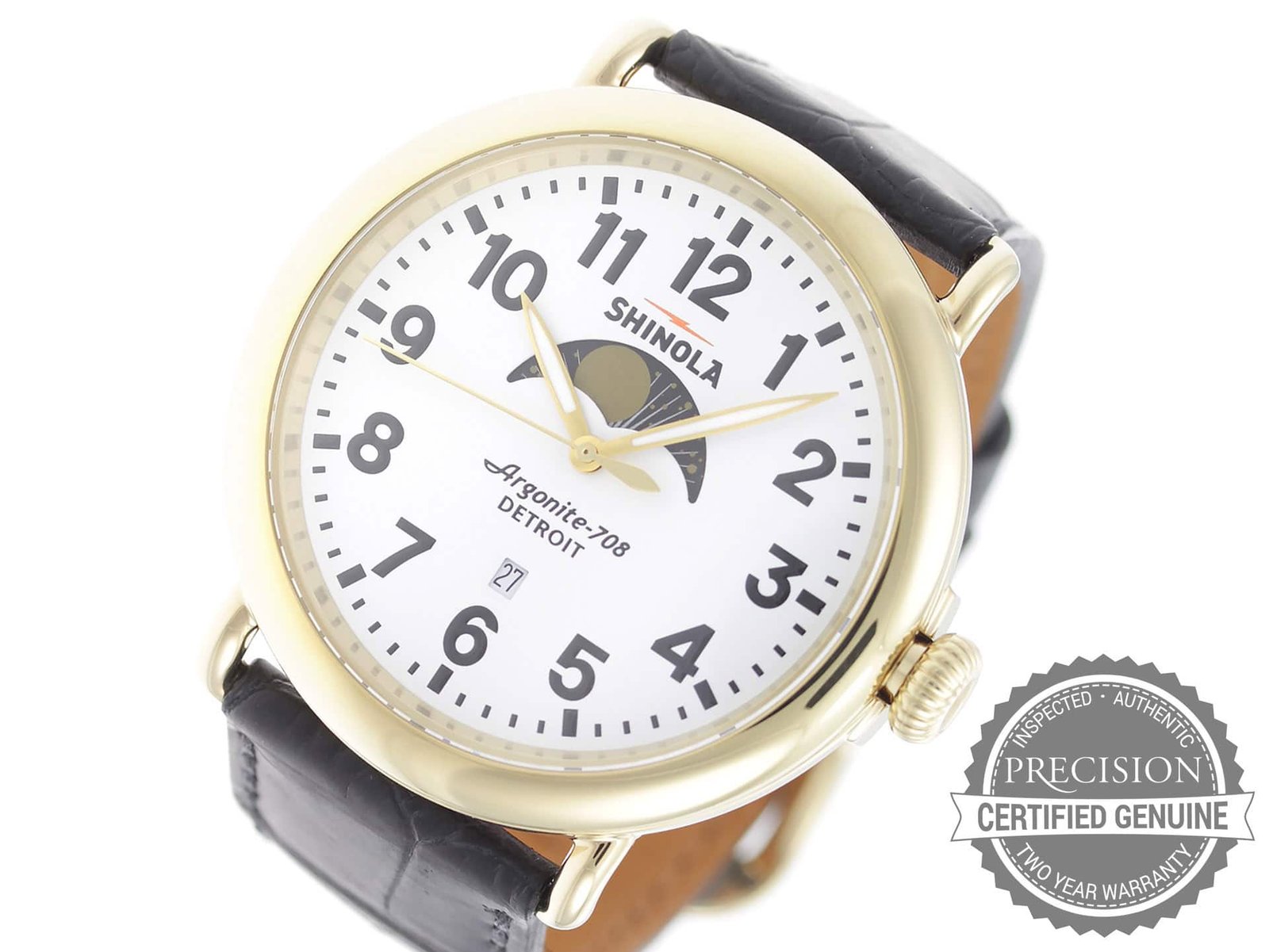 Gold PVD stainless steel case, on black leather strap Shinola The Runwell Moon Phase 47mm 10000180 men’s watch with white dial.