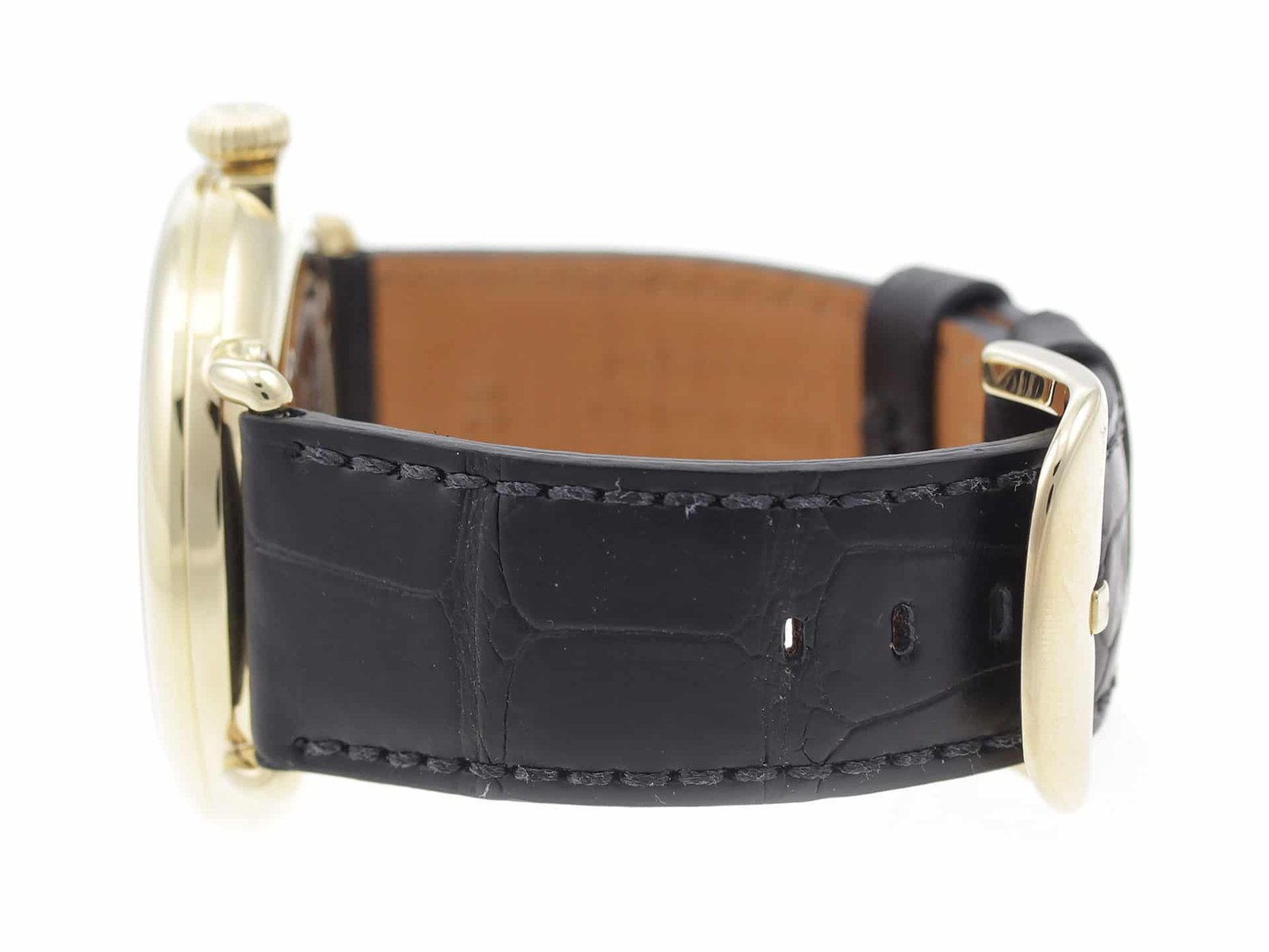 | Material: | Gold PVD Stainless Steel | Band: | Black Leather Alligator Strap | |