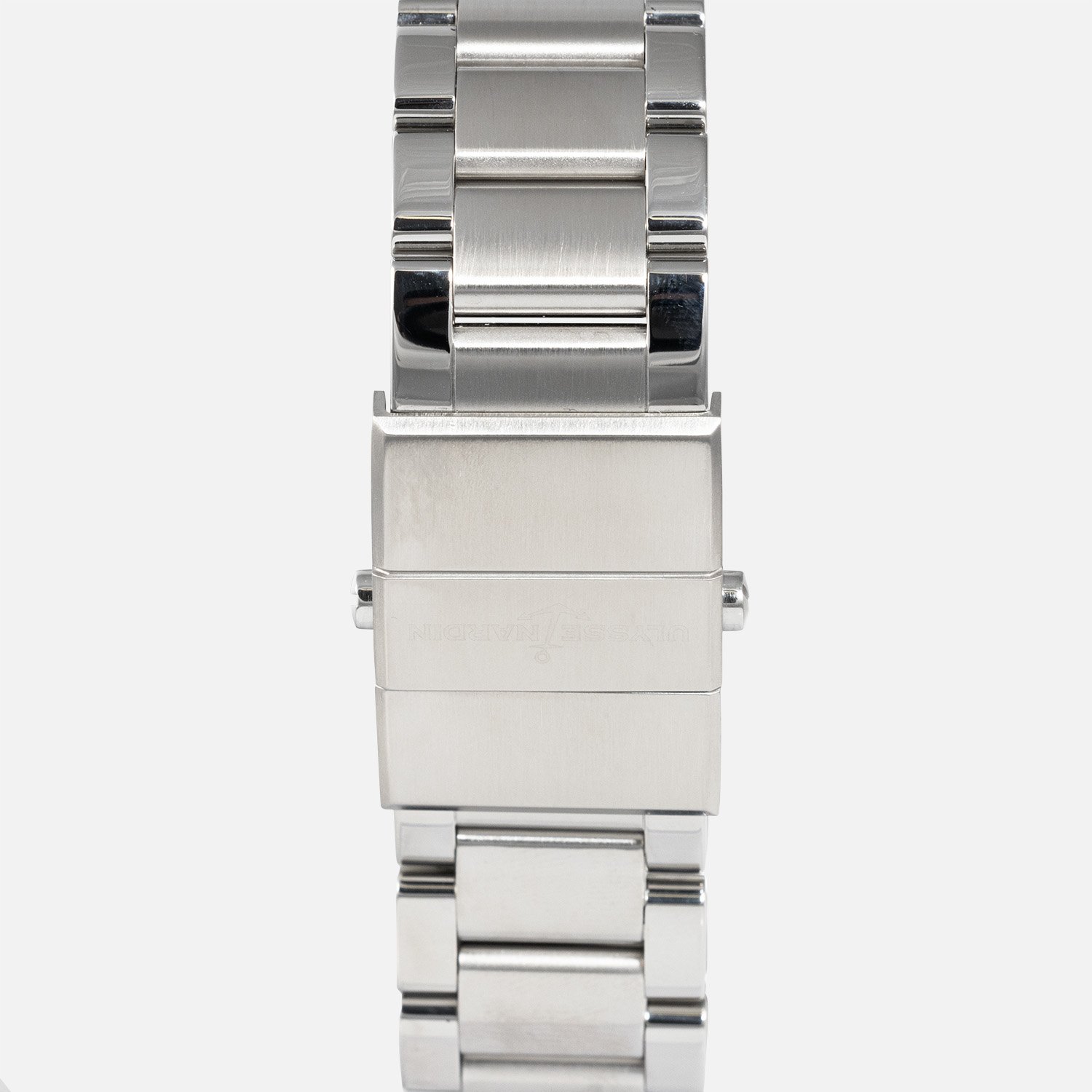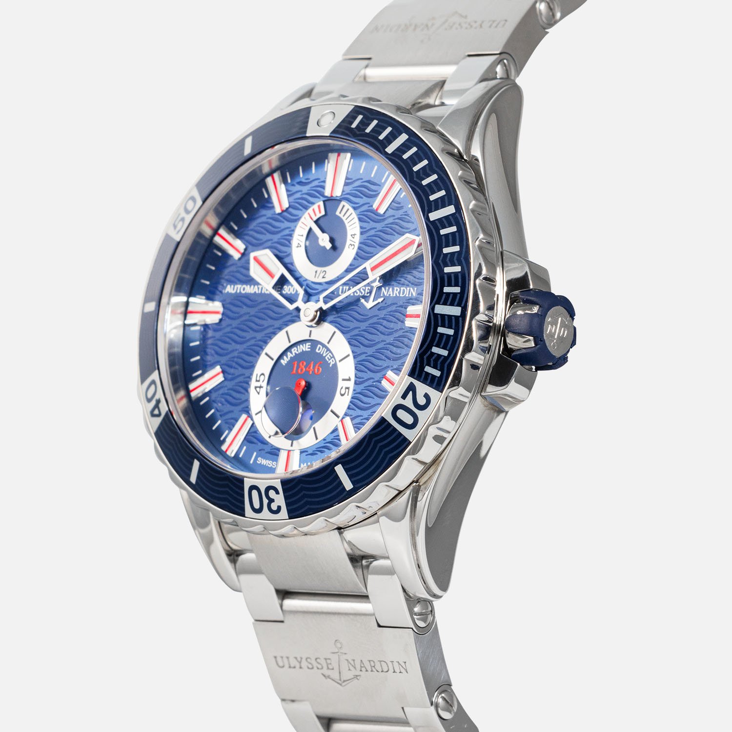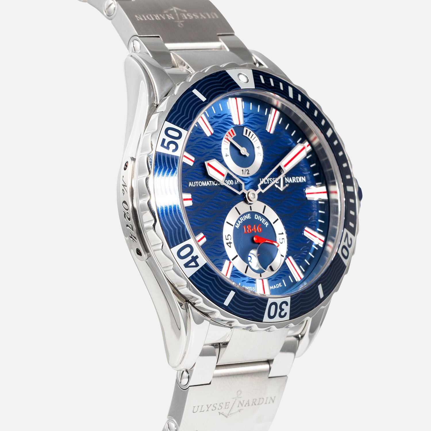 The Ulysse Nardin Maxi Marine Diver reference 263-10-3/93 is a bold and technical luxury dive watch built for reliability and presence. Its 44 mm stainless steel case is fitted with a unidirectional rotating bezel featuring a blue rubber inlay and scalloped edge for grip. The blue dial is decorated with a subtle wave pattern and houses a small seconds subdial at 6 o’clock, a power reserve indicator at 12 o’clock, and a round date window within the small seconds register.