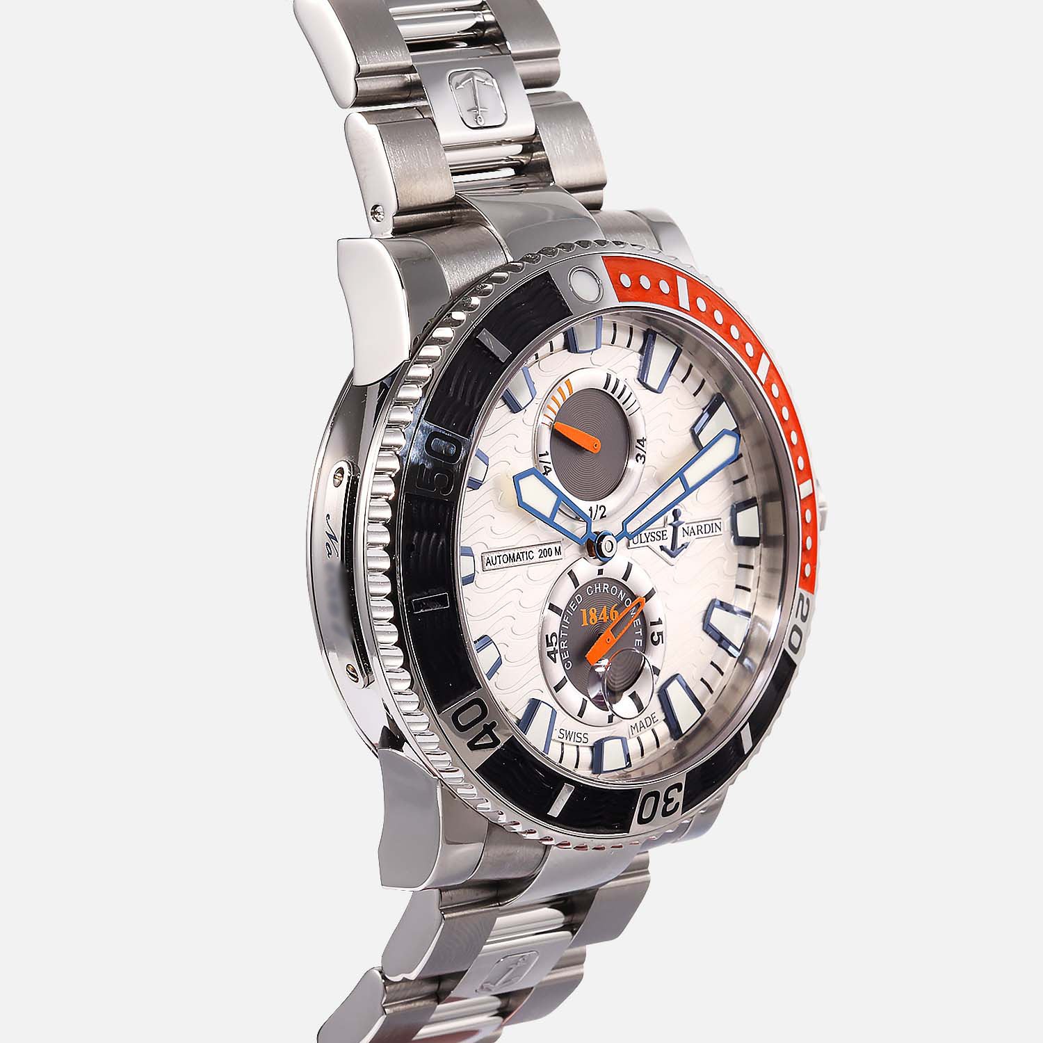 Discover unparalleled underwater precision with the Ulysse Nardin Maxi Marine Diver, a distinguished member of the Marine Diver collection. This pre-owned masterpiece, with undated card authenticity, combines cutting-edge design and robust functionality to deliver an extraordinary diving experience.