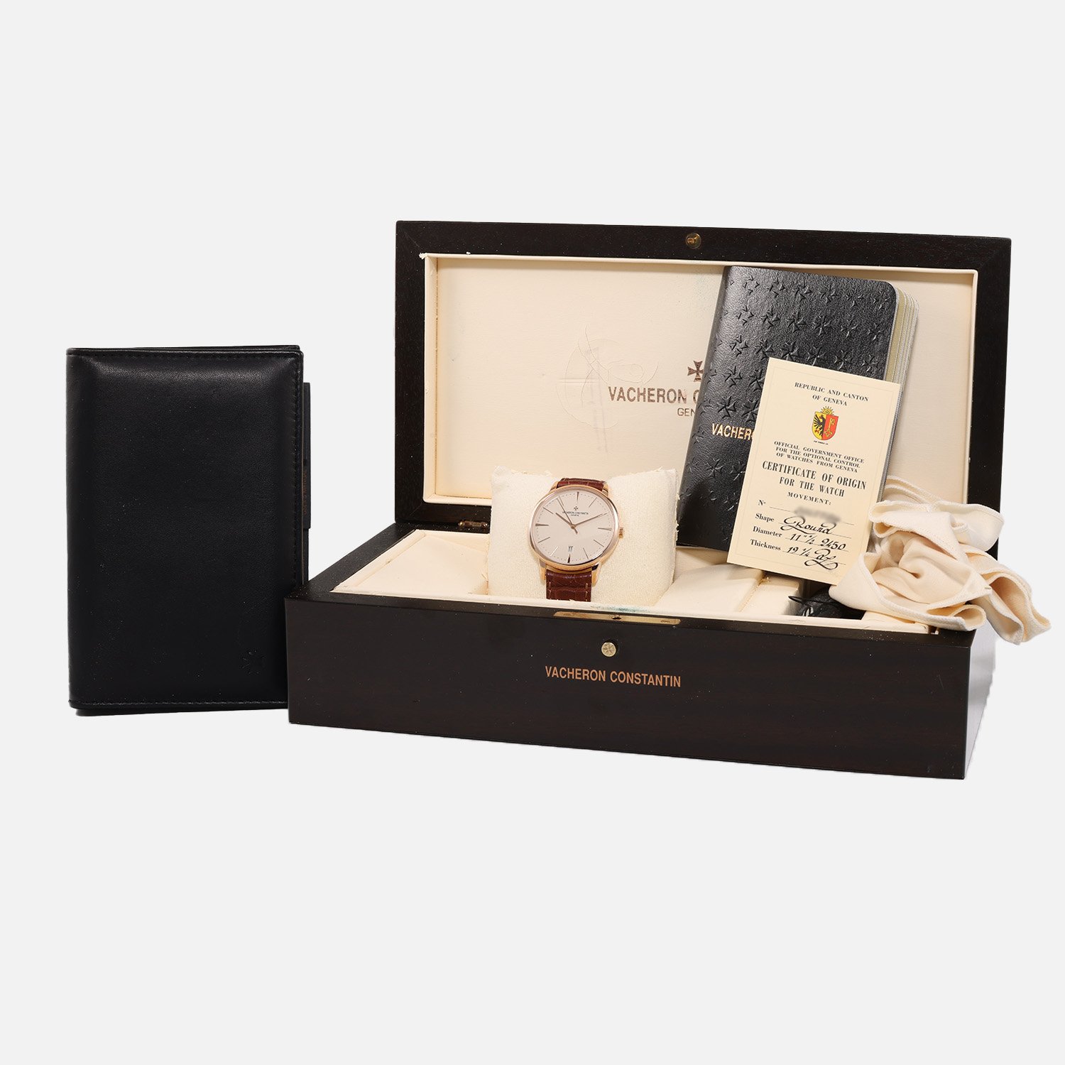 When you purchase the Pre-Owned Vacheron Constantin Patrimony Self-Winding 85180/000R-9248, you will receive a complete package that includes a Vacheron Constantin Box, a Vacheron Constantin Certificate of Origin, a Warranty Booklet, a User Manual, and a Flash Drive. Additionally, this package comes with a 2 Year Precision Watches Warranty, ensuring peace of mind and continued satisfaction with your exquisite timepiece.
