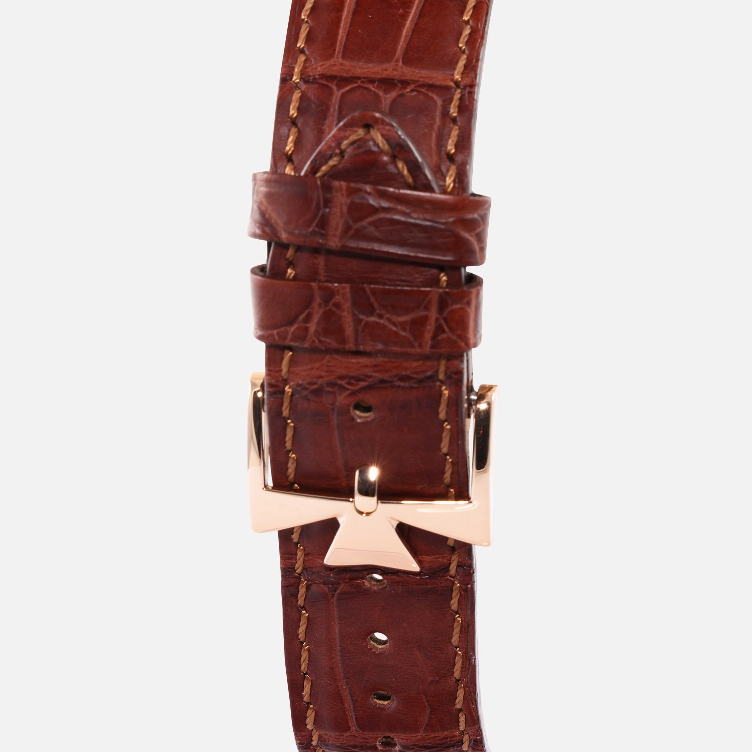 The ivory dial of the Patrimony Self-Winding is adorned with sleek index markers, providing a clean and refined aesthetic. The simplicity of the dial design, combined with the warm tones of the rose gold case, creates a harmonious and visually appealing composition that is perfect for any occasion.